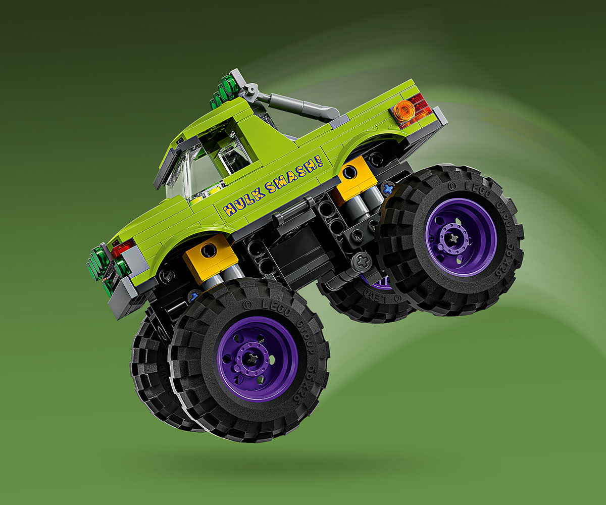 - Супергеройският камион има повдигаща се кабина, осигуряваща достъп до шофьорското място, с място за минифигурата на Хълк;