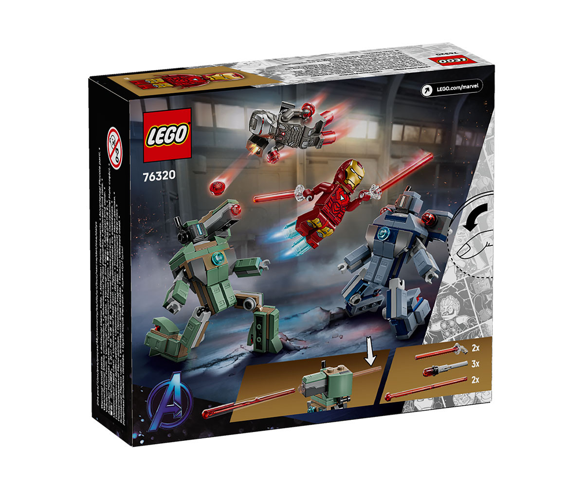 - Минифигури LEGO® ǀ Marvel – включва минифигура на Железния човек със сини бластери на ръцете и краката и оръжия с лазерен лъч и минифигура на Бойна машина с червени бластери на ръцете и краката и оръдие;