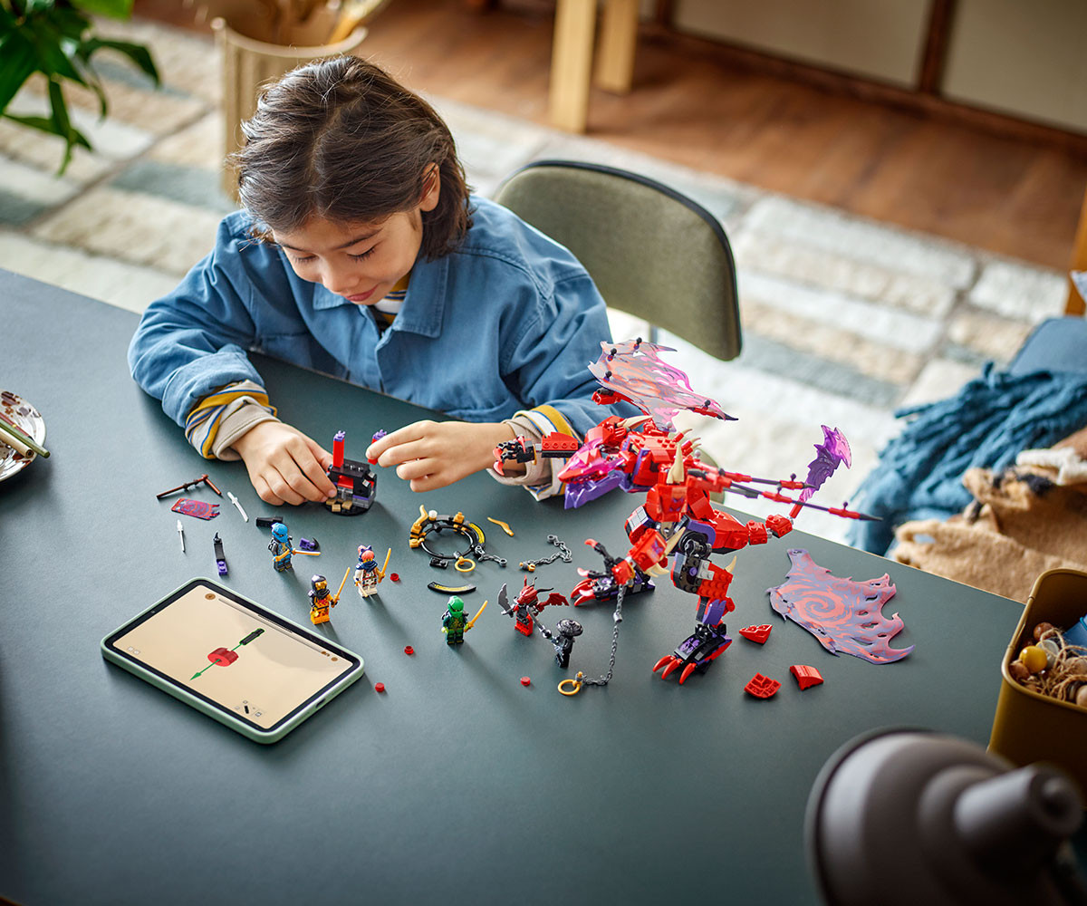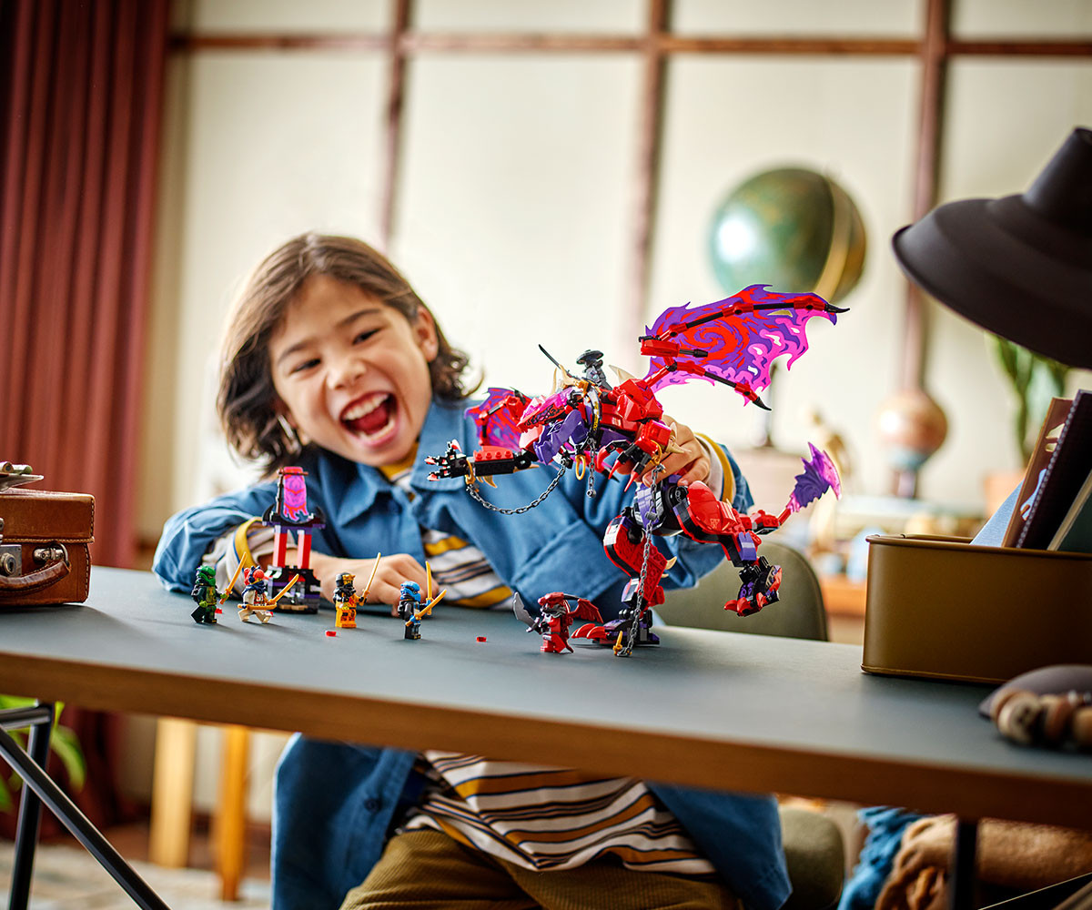 Децата разиграват екшън от сезон 3 на ТВ сериала NINJAGO® Dragons Rising с комплекта LEGO® NINJAGO Гръмотевичен зъб, Дракон на хаоса и 6 минифигури.