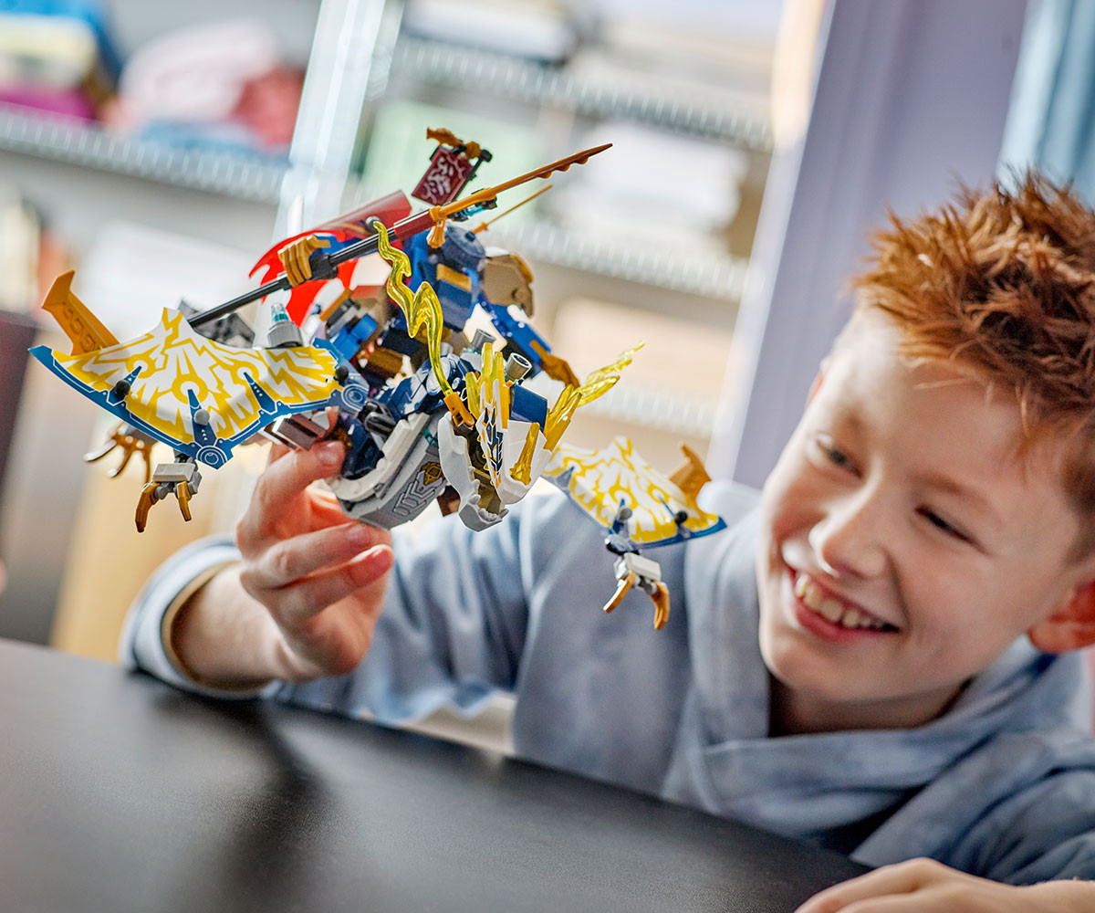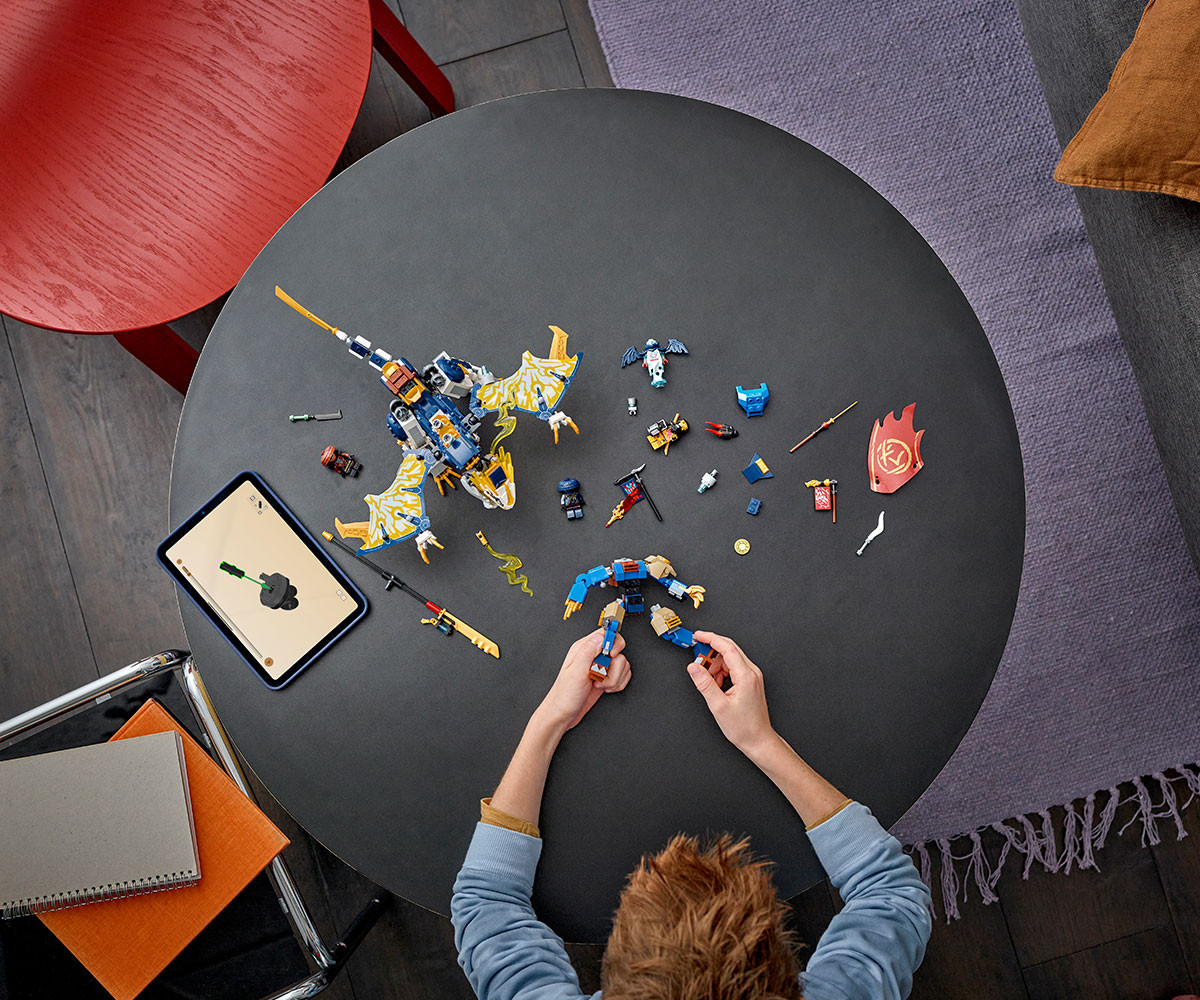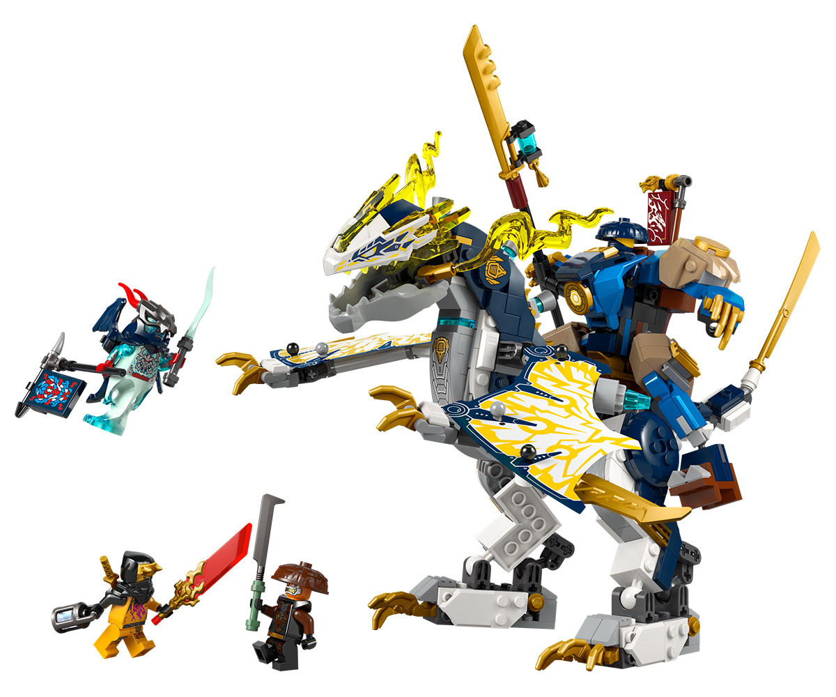 - Играчка с робот и дракон – децата могат да играят отделно с играчките или да прикрепят подвижния робот към гърба на първия по рода си драконов робот NINJAGO®, за да създадат робот драконов ездач на Разбойник;