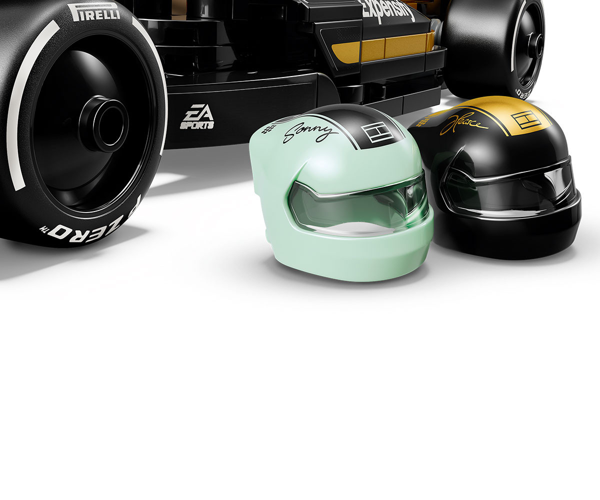 - 2 минифигури на пилоти от F1® - комплект с модел на състезателна кола с 2 минифигури от „F1® Филмът“: Сони Хейс и Джошуа Пиърс, които имат шлемове с техните подписи