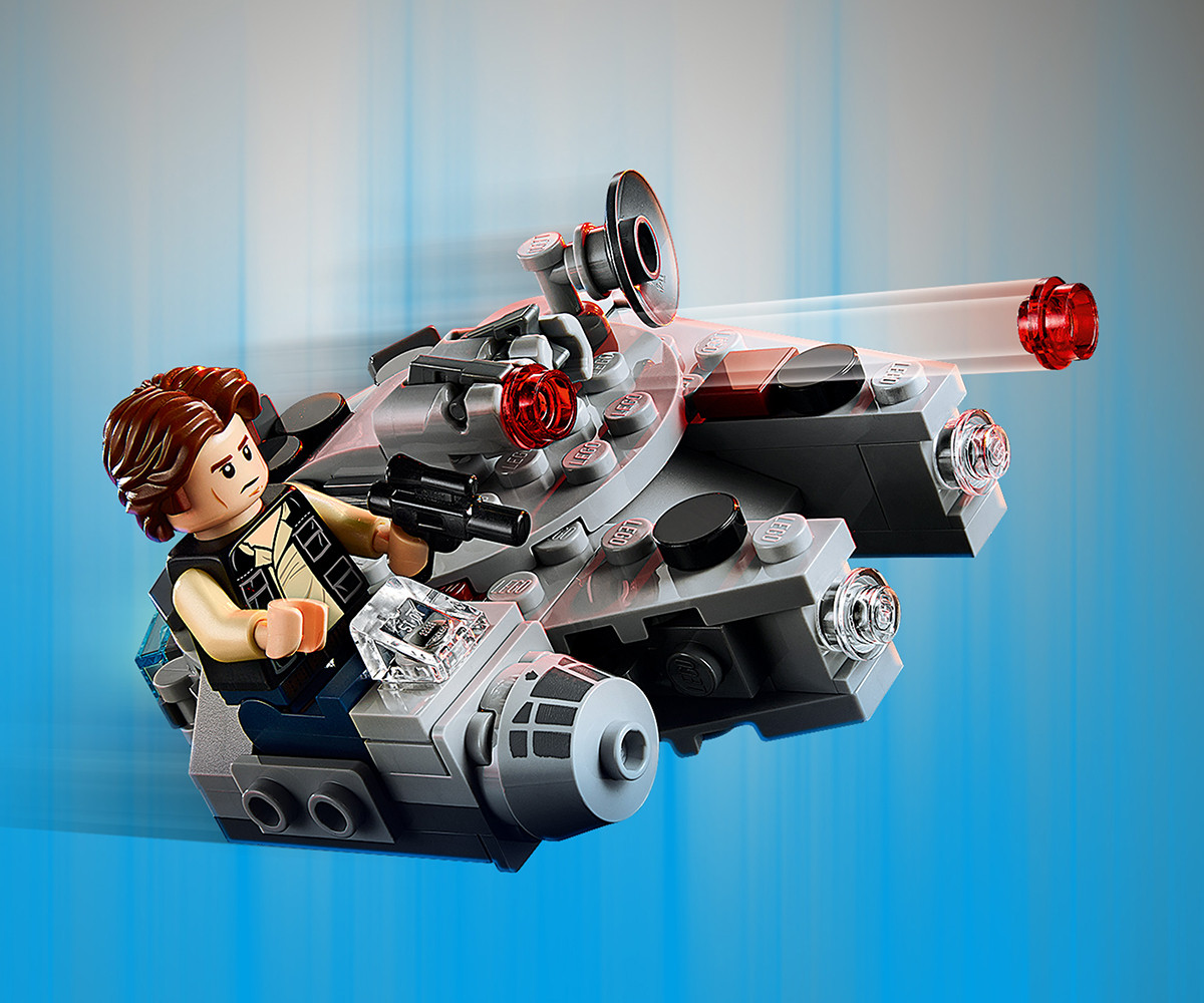 Призовават се всички бунтовнически герои! Сглобете страхотния Millennium Falcon Microfighter и се впуснете в дръзки мисии заедно с Han Solo. Скочете в пилотската кабина и се изстреляйте в космоса. Стреляйте с оръдията по космическите кораби на Империята и отблъсне враговете с бластерния пистолет на Han. После включете двигателя за хиперпространство, за да достигнете максимална скорост и да избягате в безопасност.
