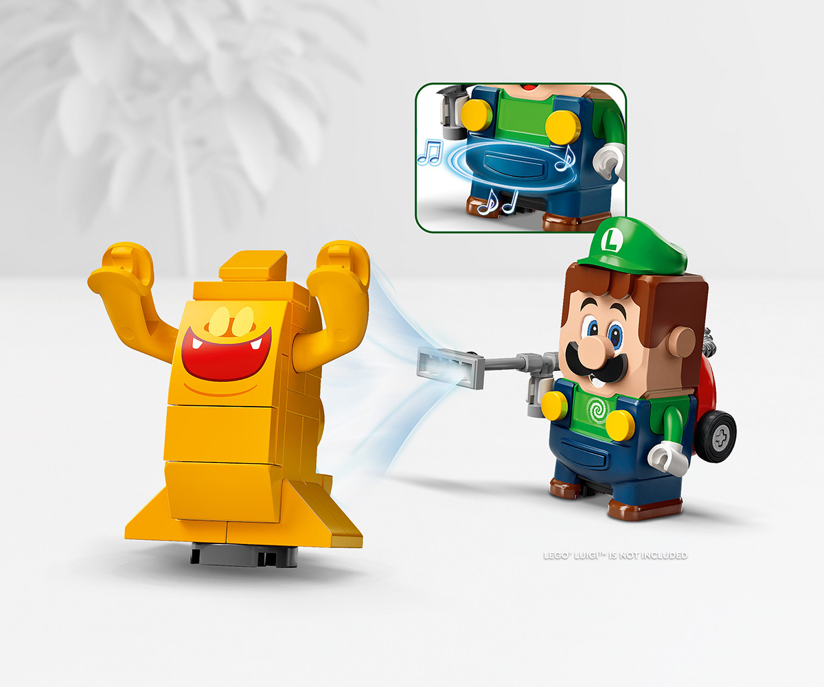 Пригответе се за приключенски лов на призраци в построения от тухлички комплект Luigi’s Mansion™. Облечете костюма на Poltergust и сглобете нормалния накрайник или аксесоара лампа Strobulb. Натиснете бутона, за да уловите Gold Ghost, а след това спечелете още монети за разговори с Professor E. Gadd. Вземете награда монети от машината в лабораторията и проверете отварите – но внимавайте да не се отровите, иначе ще ви трябва противоотрова!