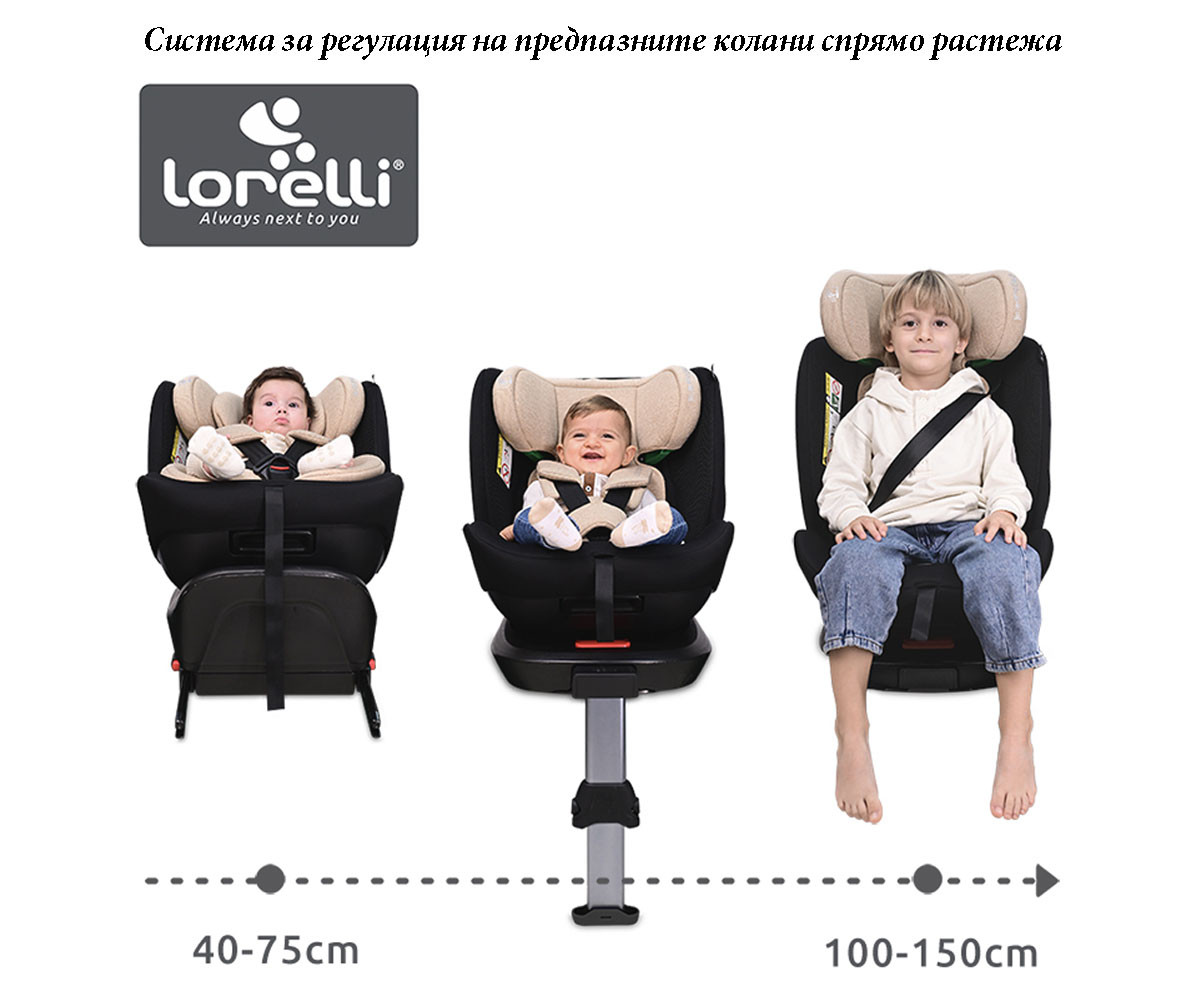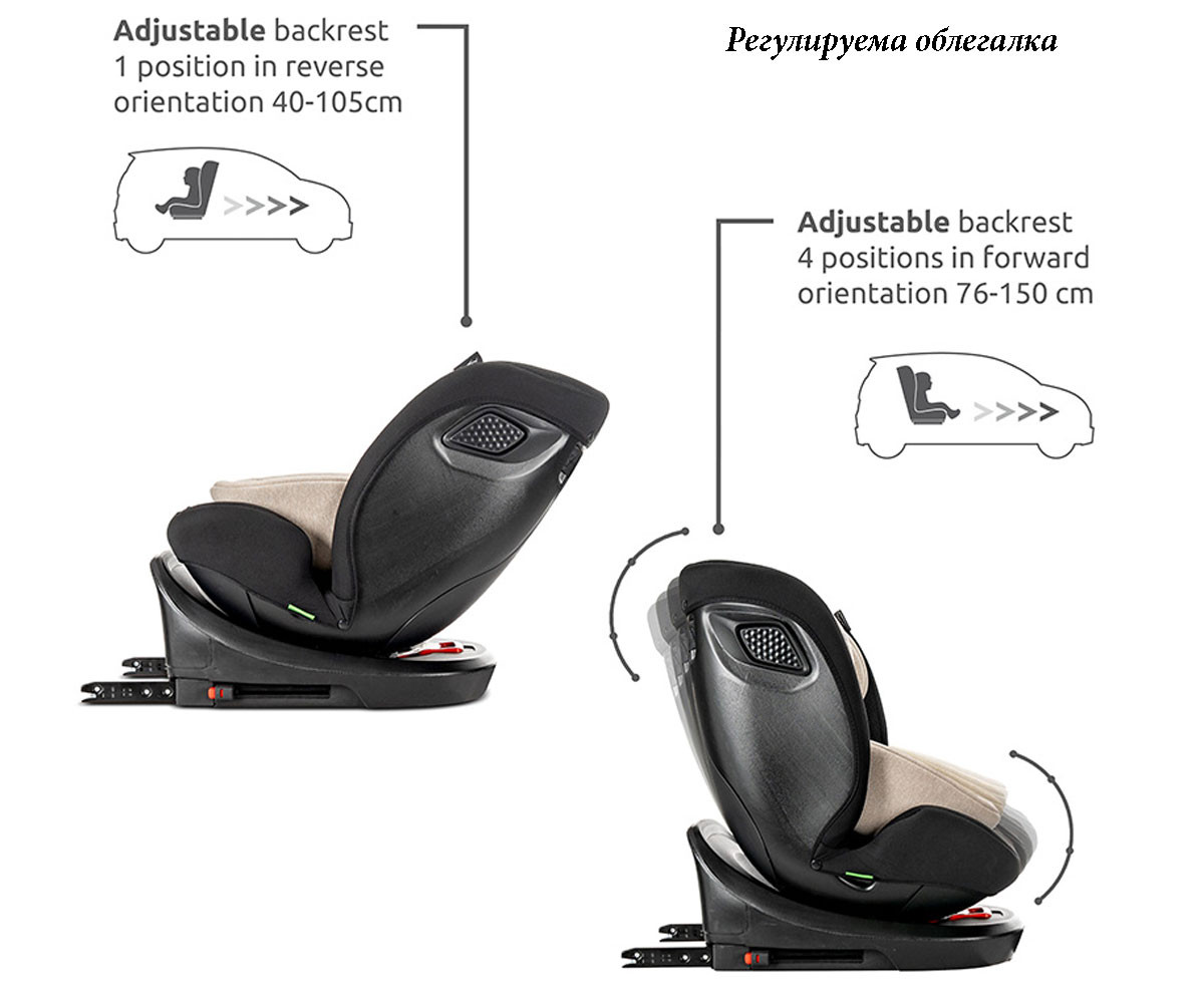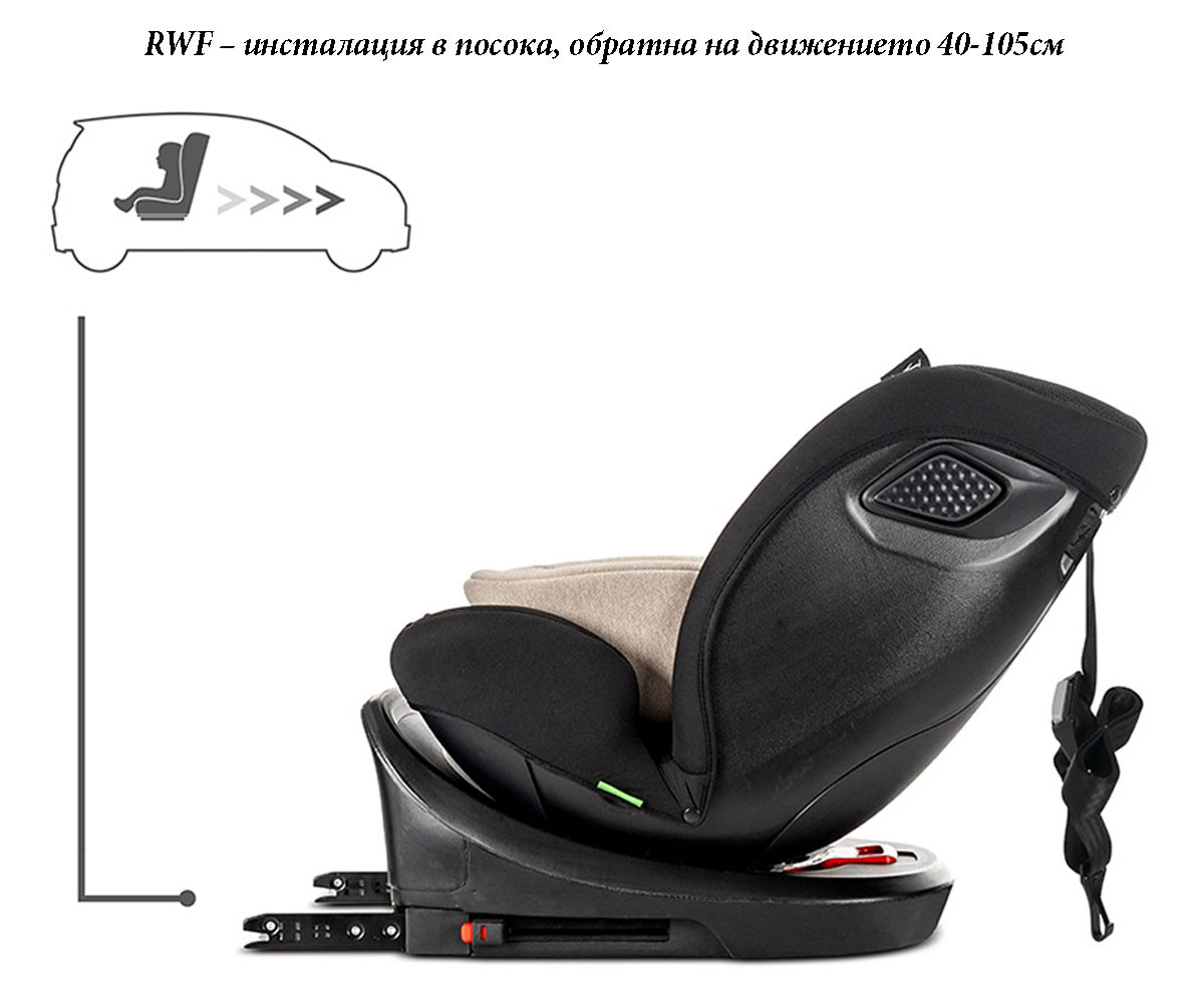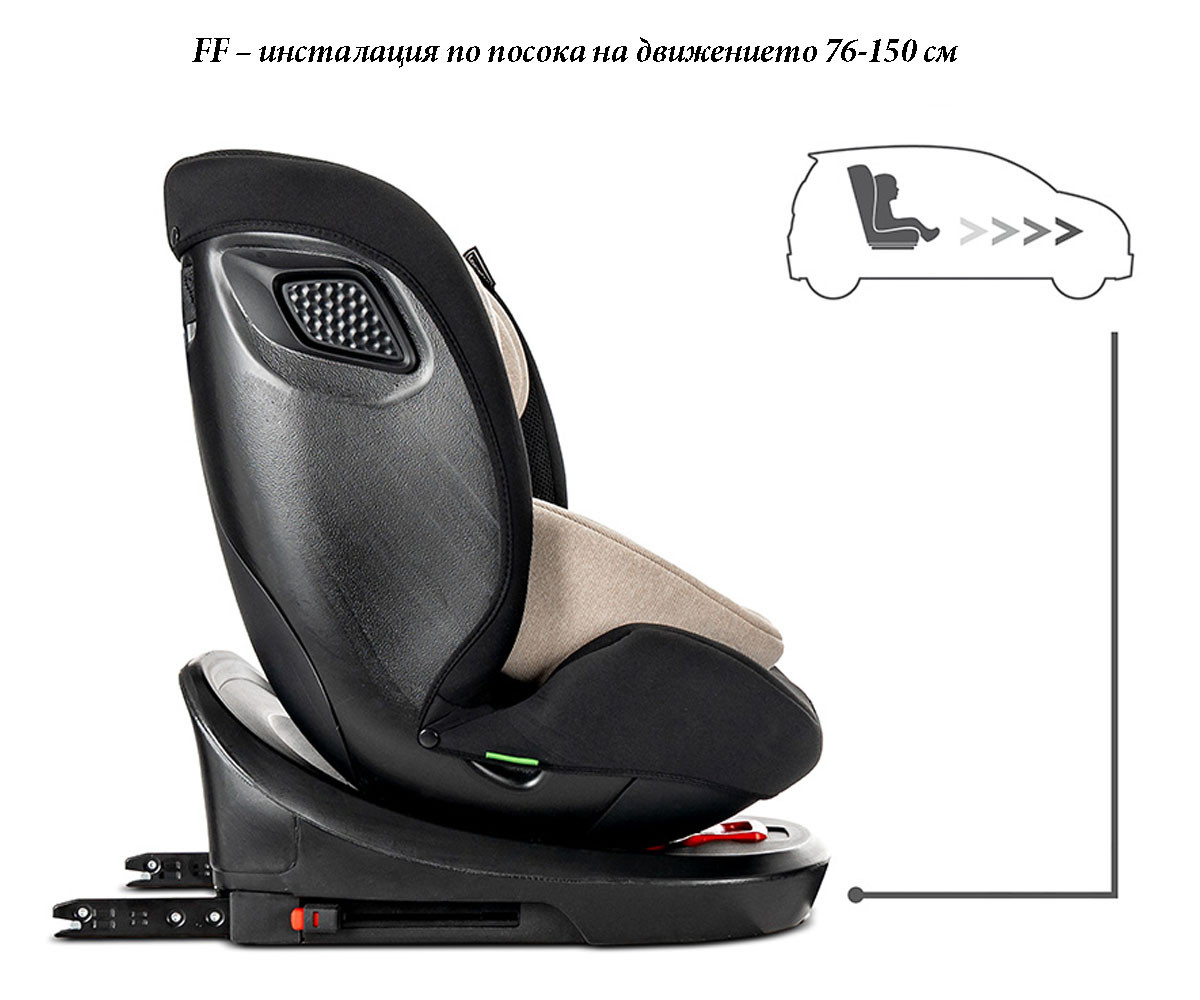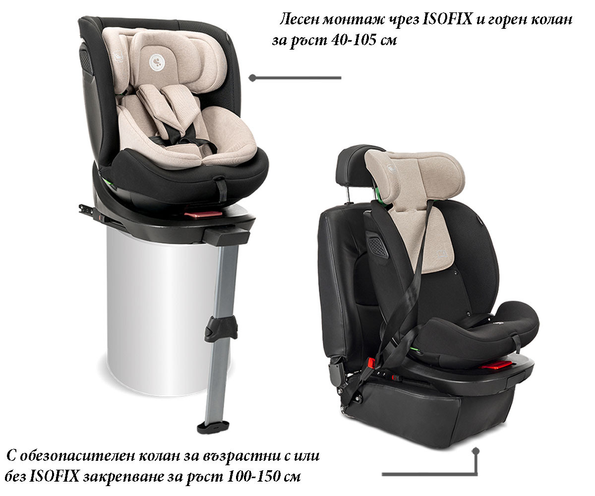 - Лесен монтаж чрез ISOFIX и горен колан за ръст 40-105 см и с обезопасителен колан за възрастни със или без ISOFIX закрепване за ръст 100-150 см;