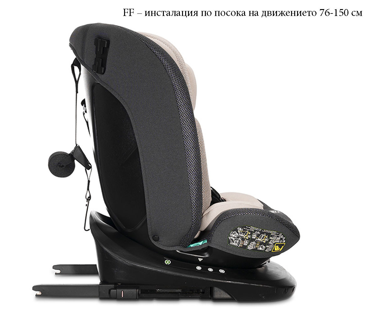 - Лесен монтаж чрез ISOFIX и горен колан за ръст 40-105 см и с обезопасителен колан за възрастни със или без ISOFIX закрепване за ръст 100-150 см;