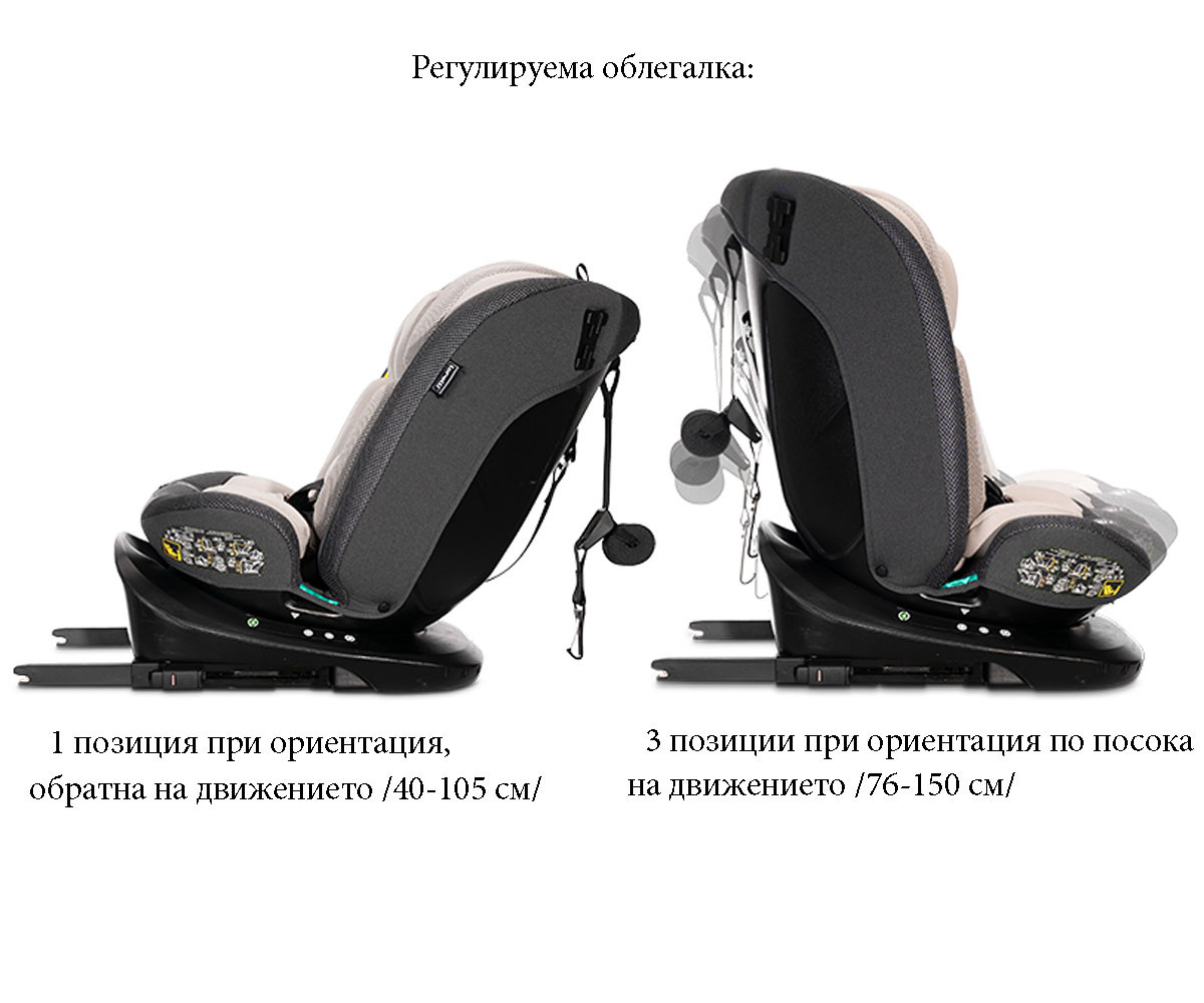 - Регулируема облегалка: - 1 позиция при ориентация, обратна на движението /40-105 см/ - 3 позиции при ориентация по посока на движението /76-150 см/;