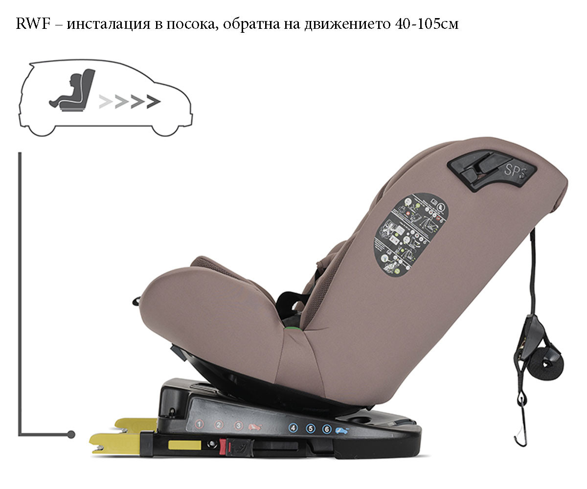 - Лесен монтаж чрез ISOFIX и горен колан за ръст 40-105 см и с обезопасителен колан за възрастни със или без ISOFIX закрепване за ръст 100-150 см;