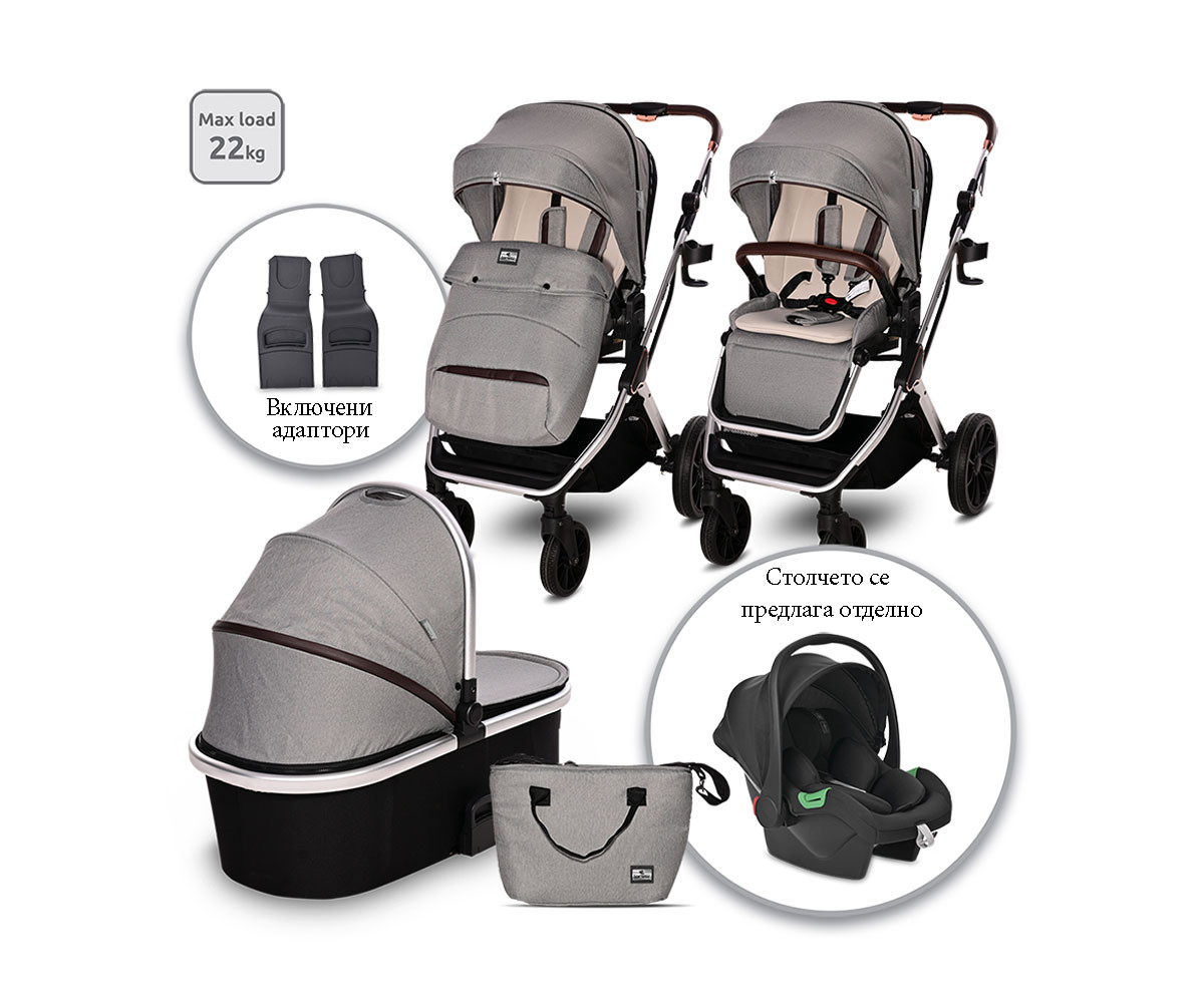 Lorelli - Комбинирана бебешка количка до 22кг с адаптори Glory 2в1, Opaline Grey
