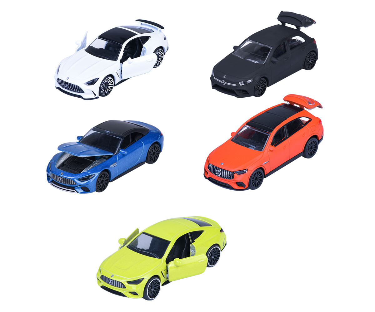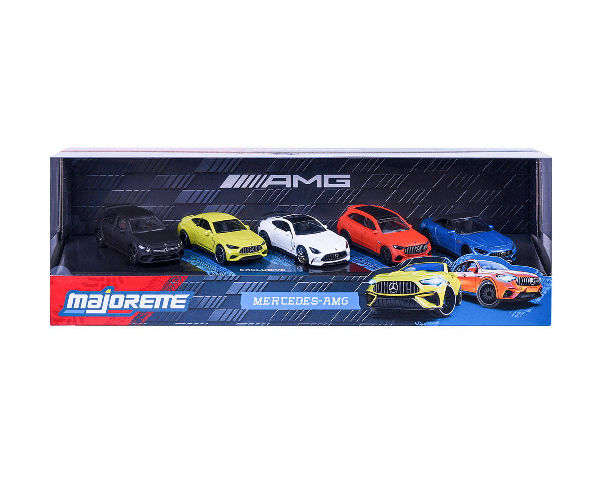 Подаръчният комплект Mercedes-AMG (5 броя) събира в миниатюрен мащаб някои от най-емблематичните автомобили на AMG. Всеки модел Majorette е с дължина 7.5 см, изработен е от лят метал, има свободно въртящи се колела, окачване, както и реалистични детайли като отварящи се врати и капаци.