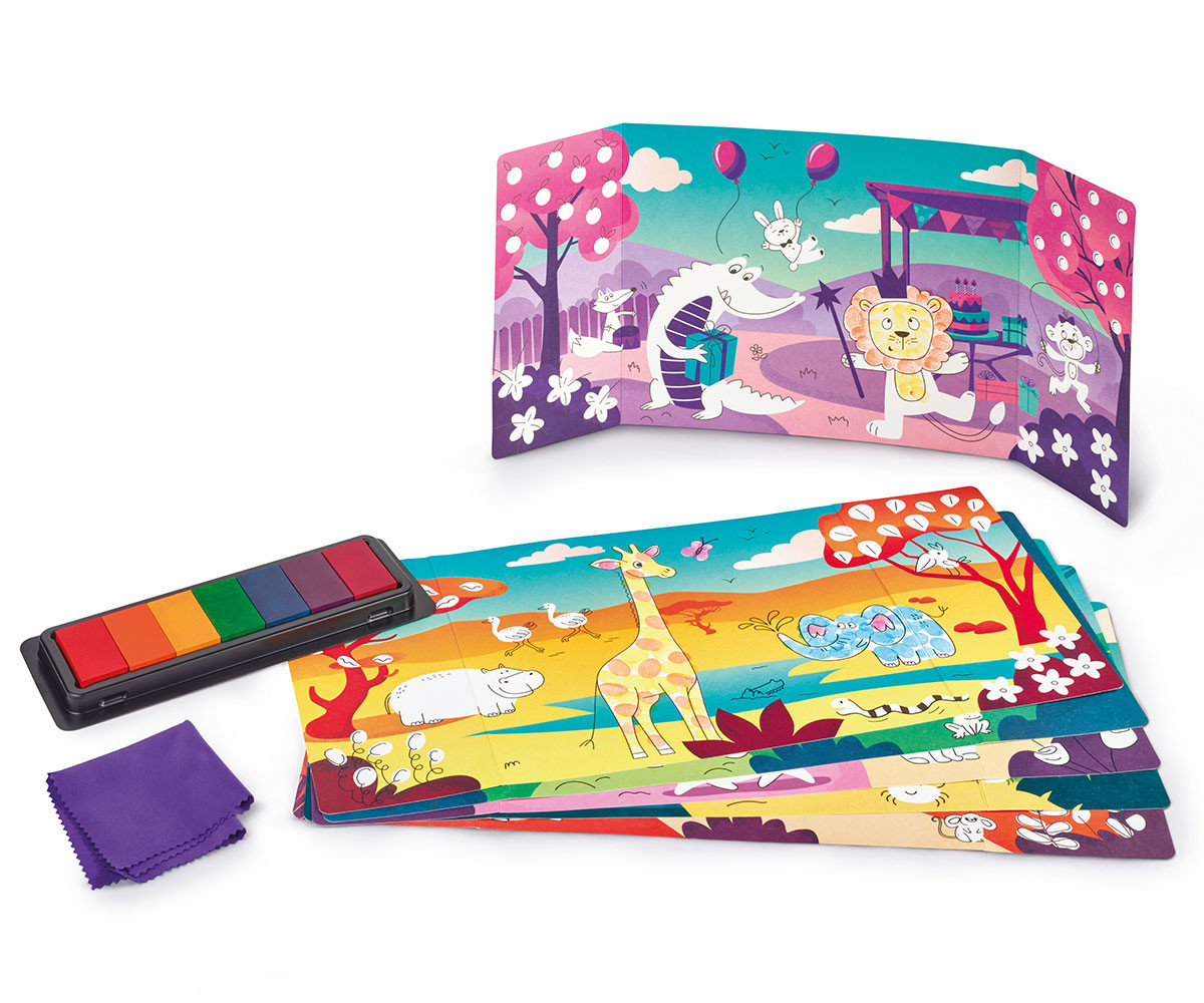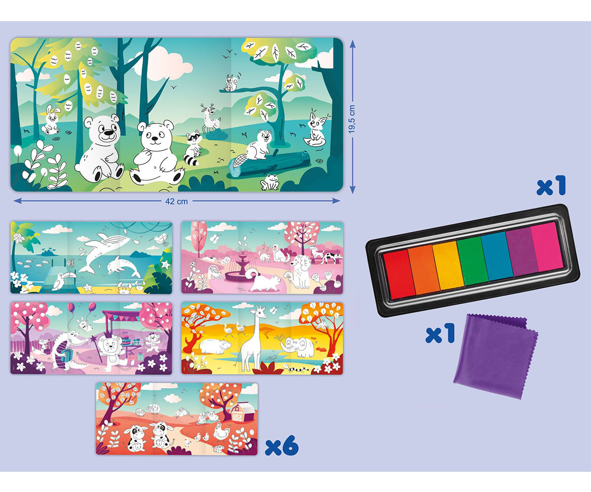 Без моливи и четки - само пръсти! Забавен начин за откриване на рисуването и координацията око-ръка. Гарантиран резултат - чрез отпечатване с пръсти, детето украсява илюстрираните карти с подходящи цветове. Тампон с 7 цвята мастило – стимулира въображението и създава уникален, цветен свят.