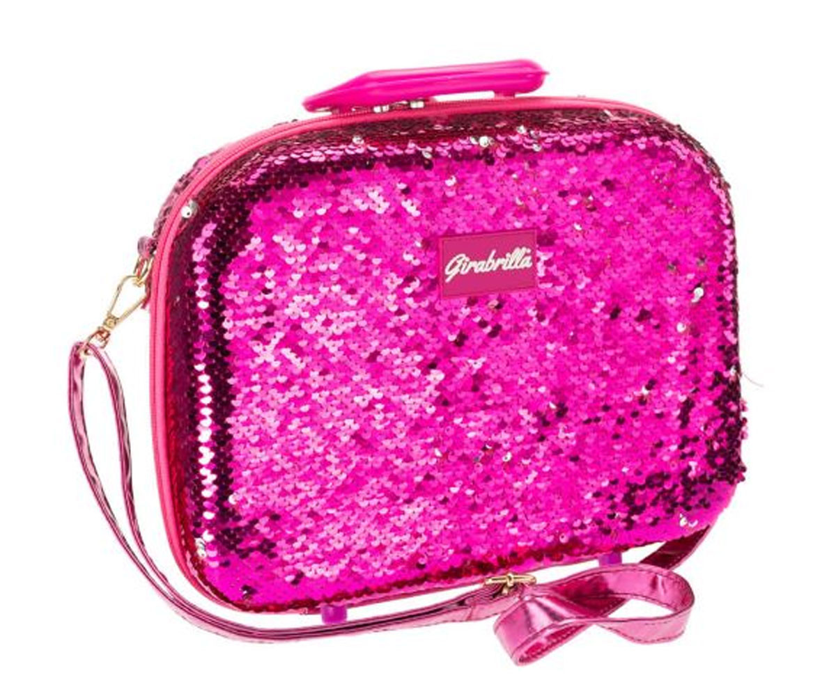 Куфарче, покрито с магически обърнати пайети, налично в различни цветове. Бестселърът, превърнал Girabrilla в любим бранд на всички момичета — сега дори в нови цветове и с удобна цветово съчетана презрамка. Куфарчето се превръща в напълно оборудвана гримьорна. Пробвайте различни визии с включените козметични продукти и огледало.