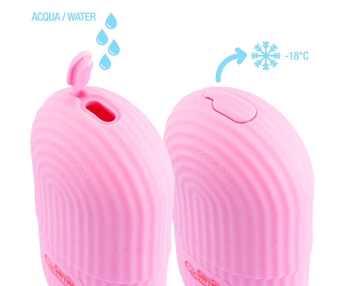 Докато двете части на формата са затворени, напълнете я през горния отвор до половината на капачето, затворете отвора и поставете във фризера за няколко часа. След като се образува ледът, продуктът е готов за употреба. [!!! Внимание !!!] Ледът може да причини раздразнение или нараняване на кожата при директен или продължителен контакт! Препоръчва се винаги да използвате уреда върху маска за лице, за да избегнете директен допир с кожата.