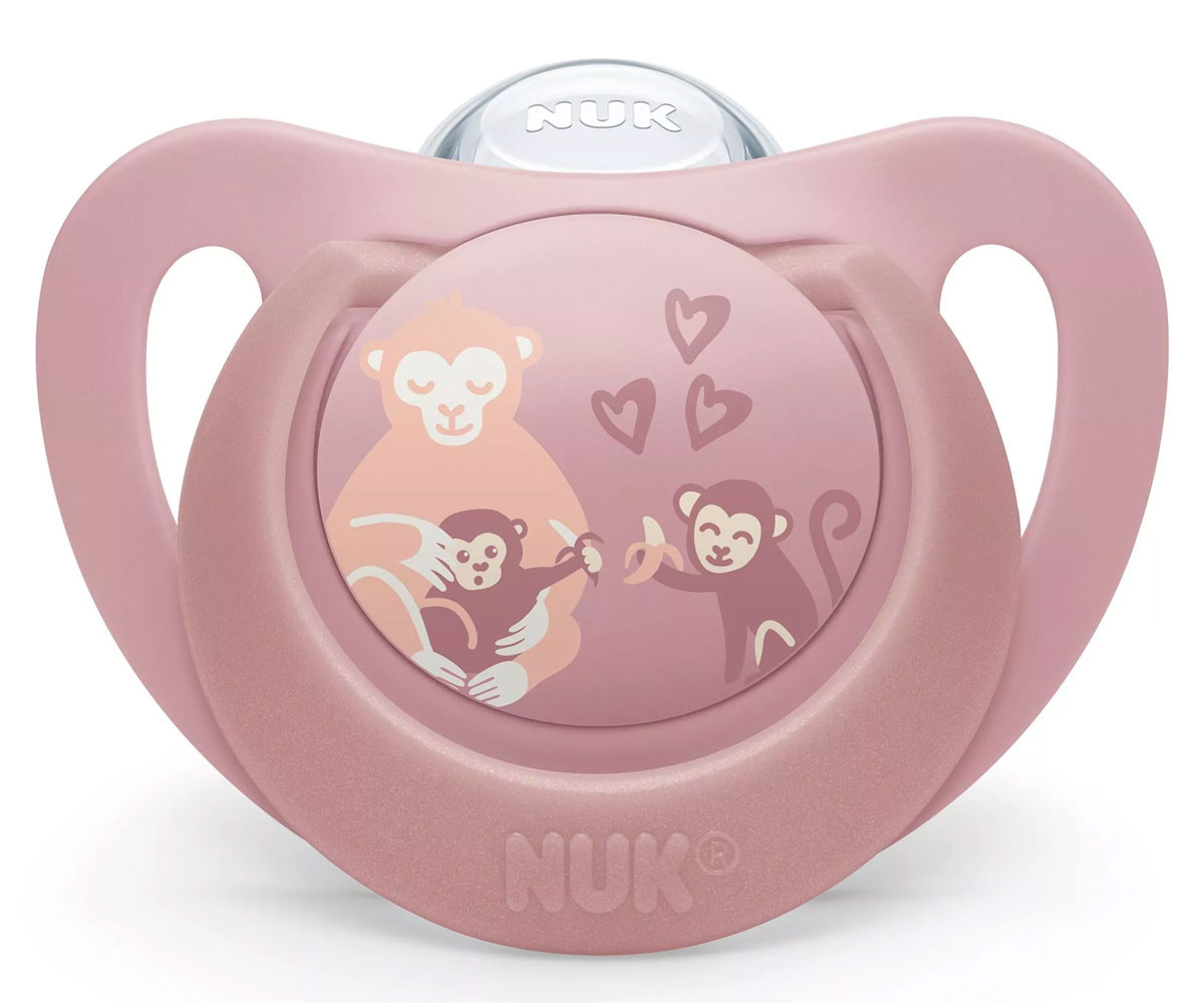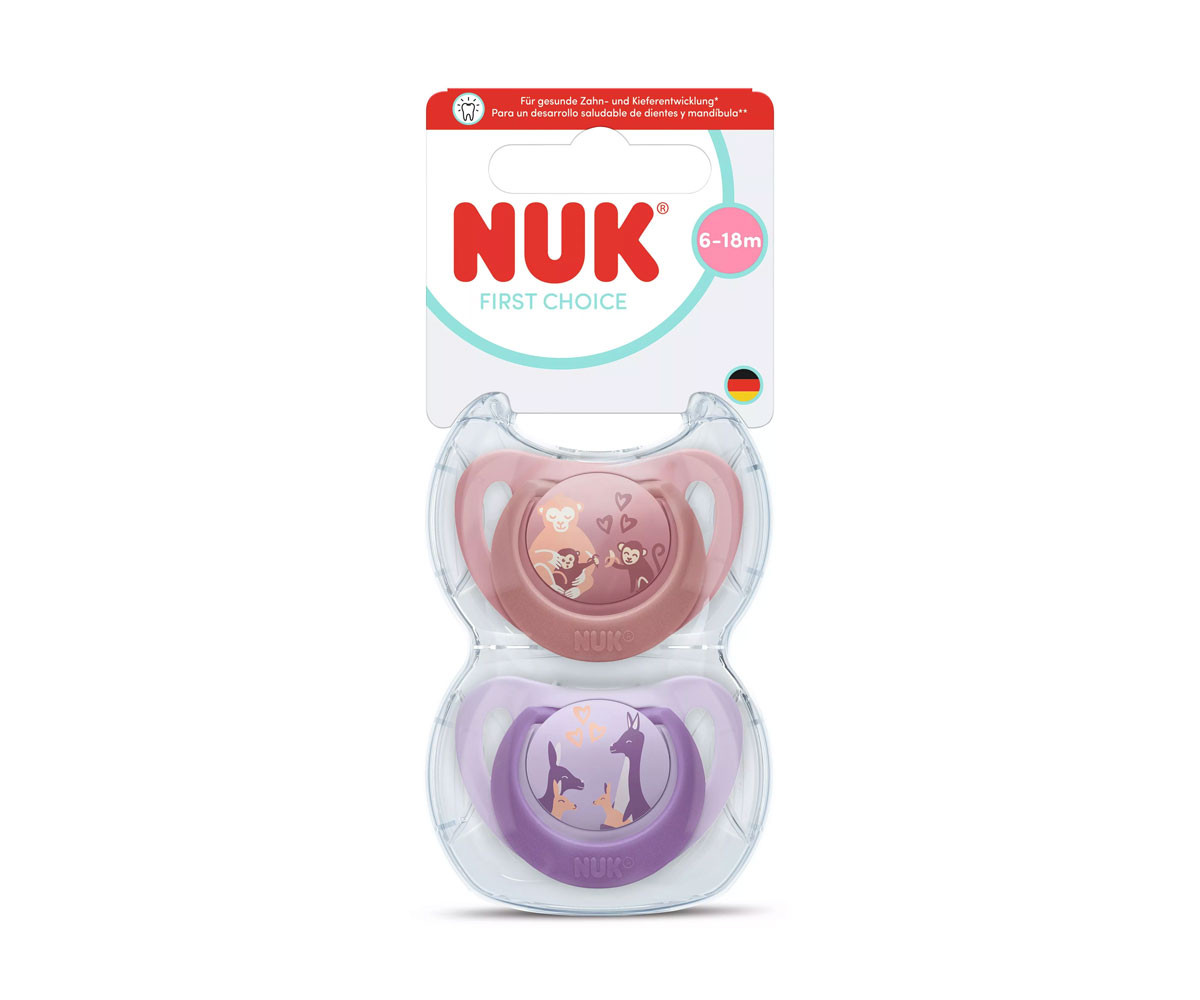 - Име: Nuk - Силиконов биберон залъгалка First Choice, 2 броя, с кутийка, 6-18м, Маймуна/Кенгуру, момиче