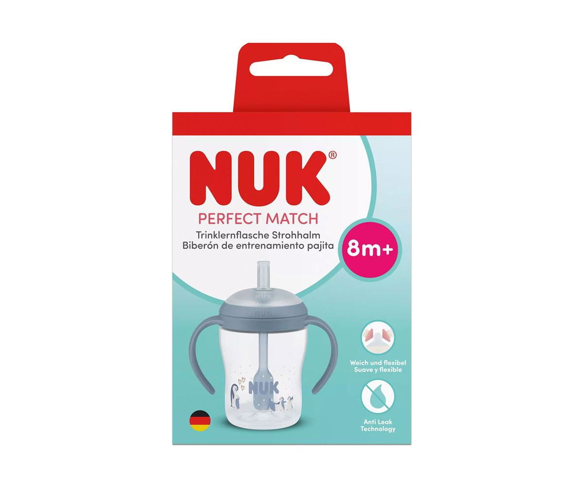 NUK пластмасово шише 150 мл със сламка е подходящо за деца на възраст 8+ месеца. Материал: продуктът е със силиконова сламка, а шишето е изработено от PP (полипропилен). Материалът полипропилен е обозначен със знака „PP“ върху самото шише. При изваряване и стерилизиране (при температура над 80 градуса) шишето винаги трябва да се разглобява на части и да се оставя отворено, тъй като в противен случай може да се получи деформация. Някои вещества, съдържащи се в напитките (например сок от моркови), могат да оцветят шишето, а други (например чай от копър) могат да повлияят на миризмата. Това обаче не намалява безопасността на продукта и не влошава неговата годност за употреба. NUK PP шише Temperature Control разполага с интегрирана скала, която показва температурата на храната. Когато индикаторът е оцветен в бяло, това означава, че храната е гореща. Средно наситено синьо показва около 37 градуса, а тъмно синьо означава, че храната е студена. Продуктът е произведен в Германия. Внимание! Този продукт трябва да се използва само под родителски контрол. Накрайникът за сок не трябва да се използва като биберон-залъгалка.
