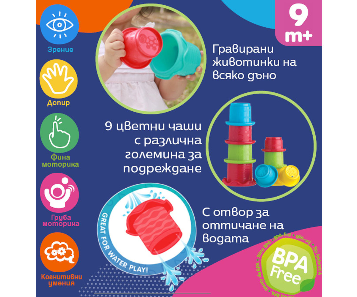 Playgro Stacking Fun Cups - комплект от 9 цветни чаши за подреждане. Осигурете на вашето мъниче часове на забавление, докато неусетно развива важни умения. С подреждане, събаряне и игра с вода, тези девет цветни чаши превръщат всяка игра в образователно приключение.