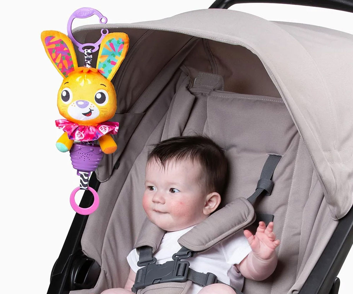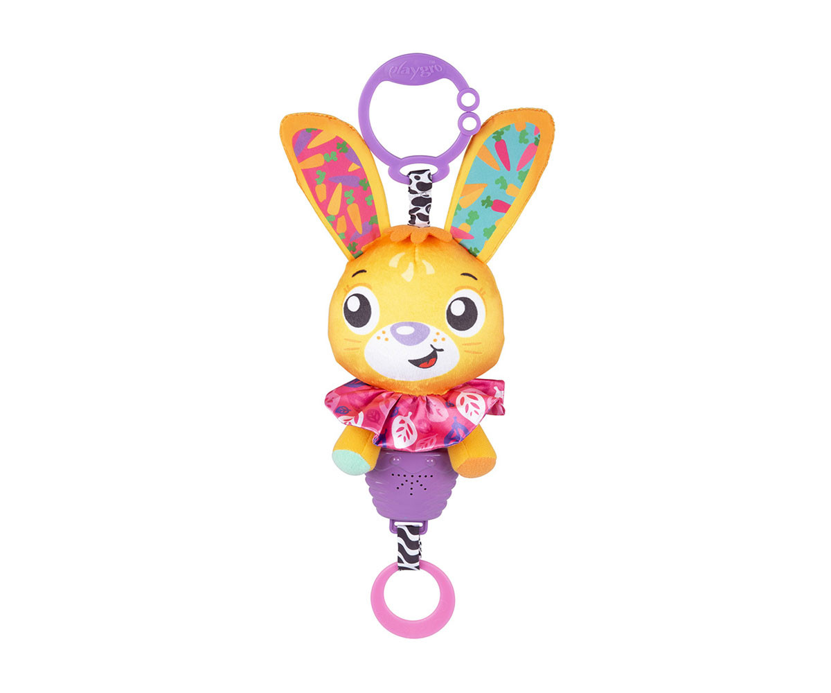 Playgro Усмихнато Зайче - музикална висяща играчка. Очарователното Усмихнато Зайче със шумкащи уши е висяща музикална играчка, която събужда любопитството на бебето и го насърчава да изследва чрез допир и движение. С удобна халка за закачване към детска количка, столче за кола или бебешко креватче. Достатъчно е да издърпате ринга надолу, за да прозвучи продължителна успокояваща мелодия.