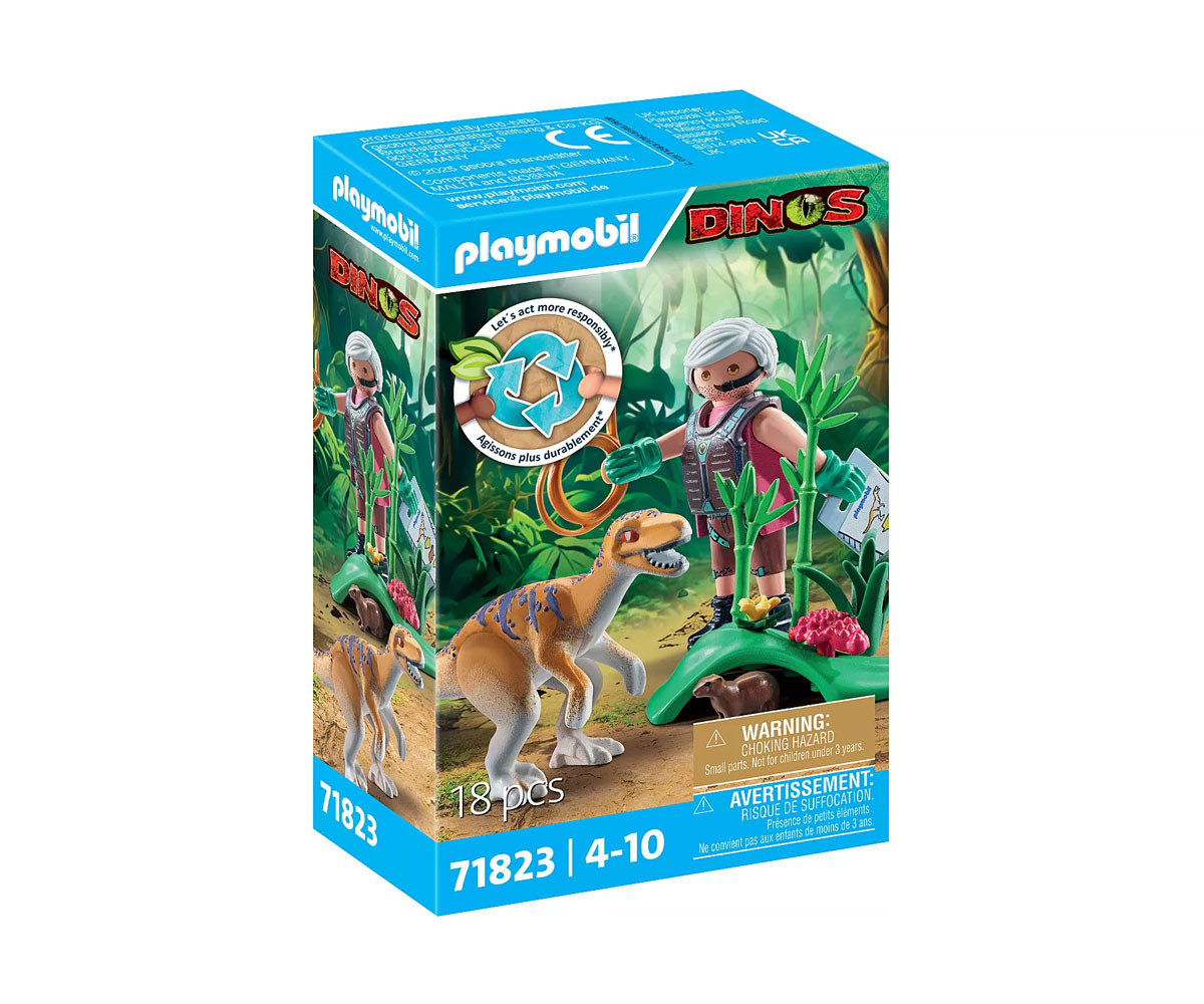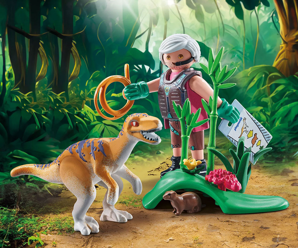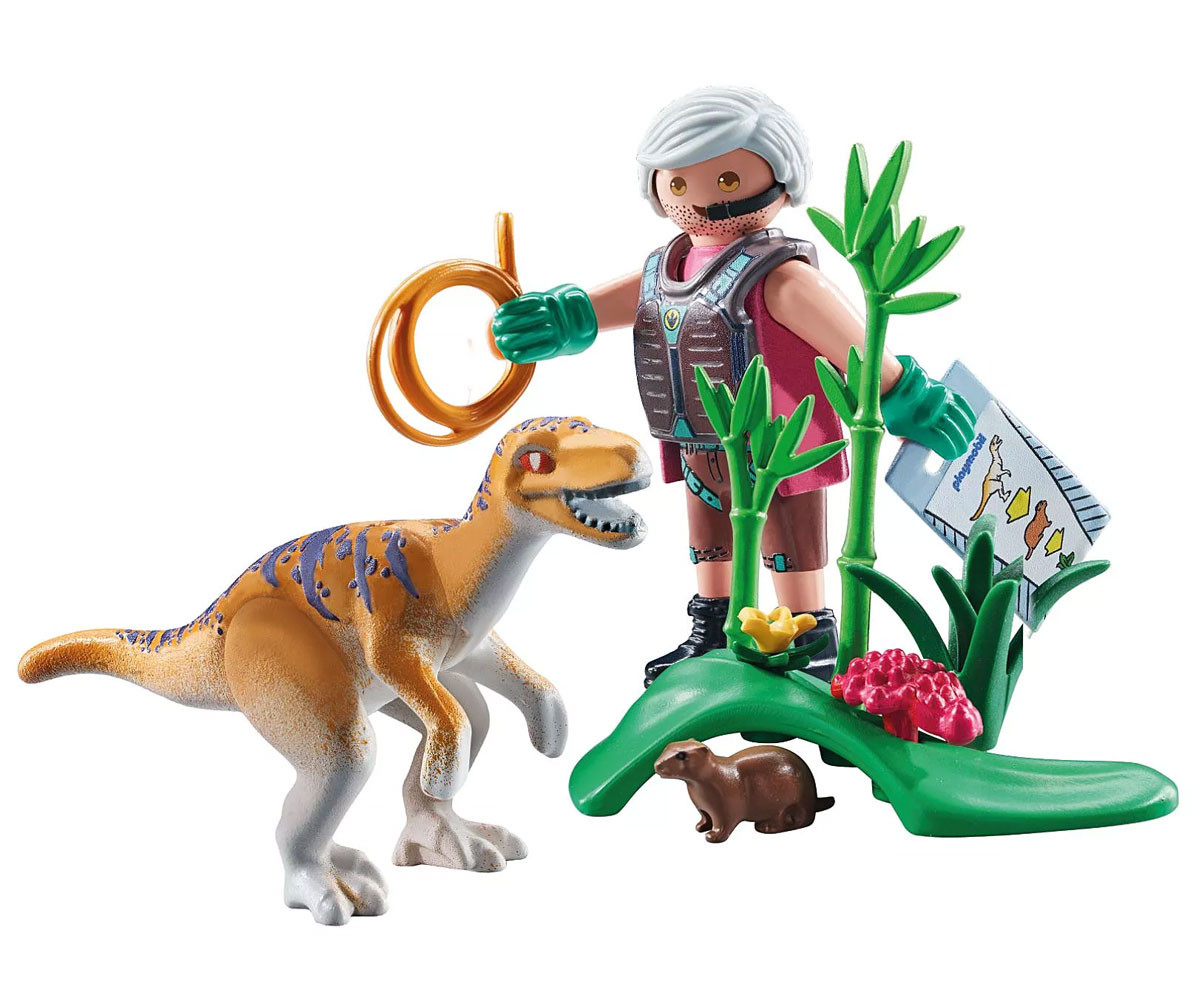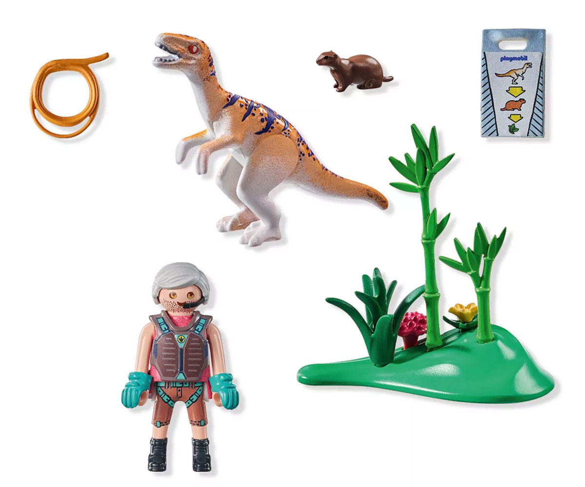 Опасен велосираптор е набелязал малък гризач, който хитро се е скрил в купчина пръст. Докато изследователят на динозаври се колебае дали да се намеси в събитията, той документира завладяващия спектакъл на естествената хранителна верига. Той е защитен от потенциална атака на велоцираптора с помощта на здрава нагръдна броня. Включена е и информационна карта за динозаври. Потопете се в праисторическо приключение с комплекта PLAYMOBIL „Велосираптор“. Станете свидетели как опасен велосираптор дебне умен гризач, скрит в купчина пръст. Решителен изследовател документира това вълнуващо природно събитие, защитен от здрава нагръдна броня. Въоръжен с карта и ласо, той улавя всеки вълнуващ момент. Насладете се на реалистична растителност, сваляща се броня и информационна карта за динозаври, която разкрива удивителни факти.