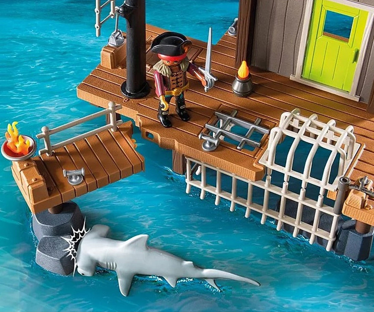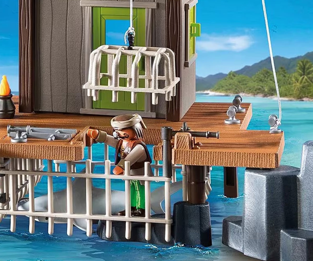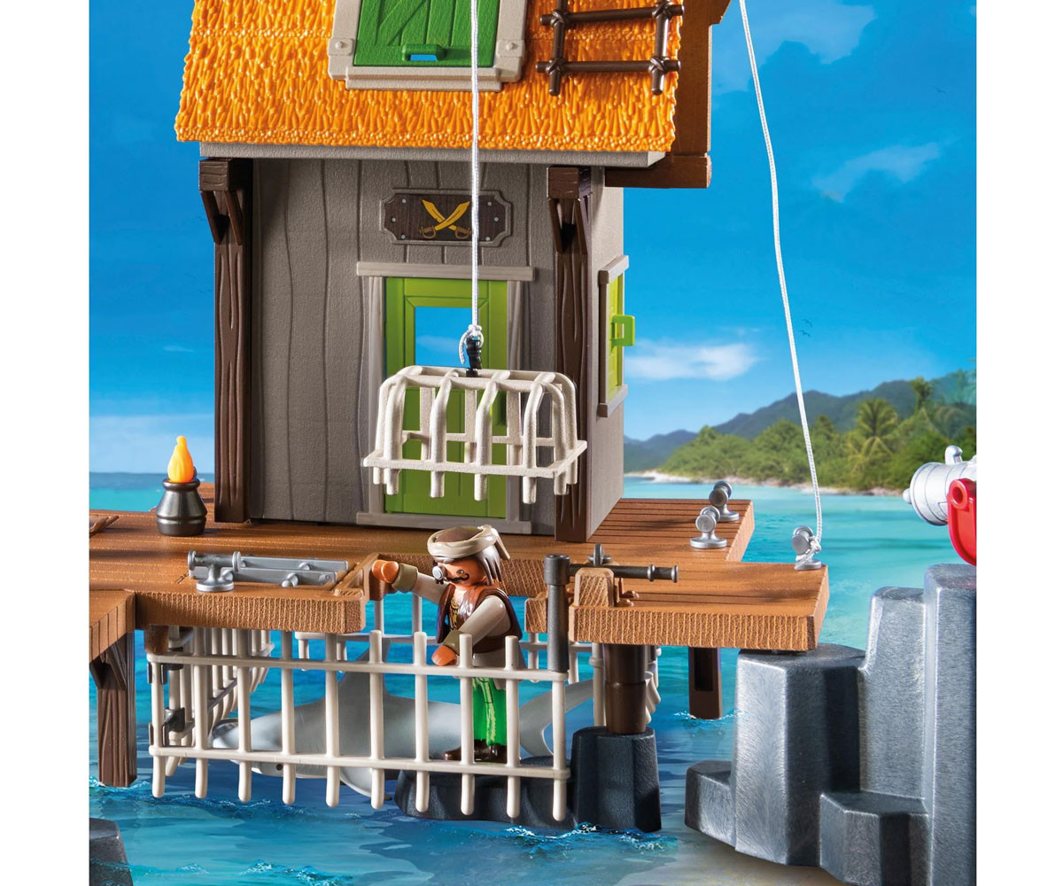 Голямото пиратско пристанище PLAYMOBIL не служи само като пристан за пиратски кораби, но и като страховит затвор! В голямата клетка под наблюдателната къщичка, могат да бъдат затворени опасни акули или пирати! Сигнал за тревога? Смъртоносното оръдие и голямата въртяща се бъчва, от която могат да бъдат хвърляни по-малки бъчви към нападателите, защитават пристанището от нашественици. Приключението те очаква в пиратското пристанище PLAYMOBIL! С пропадащи кейове, светещи в тъмното снаряди с черепи и скрито съкровище под наблюдателната платформа, това пристанище е пълно с изненади за врагвете. Хвани съперници или морски чудовища в огромната клетка и отблъсни нападателите с въртящия се кран и капаните. Плаващата лодка и яростната акула добавят допълнително напрежение към твоите пиратски истории. Този комплект PLAYMOBIL е изпълнен с дръзки функции и сложни детайли и преобразува всяка детска стая в приключение в открито море, идеален за млади пирати!