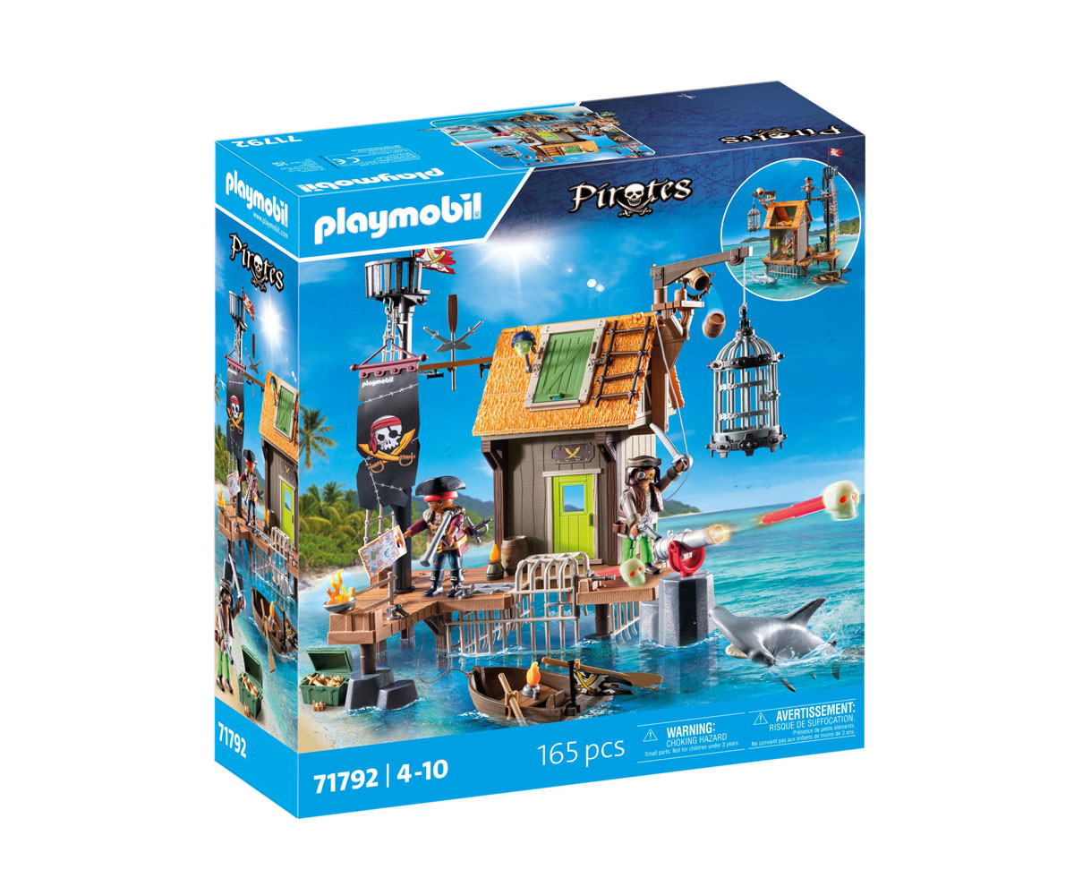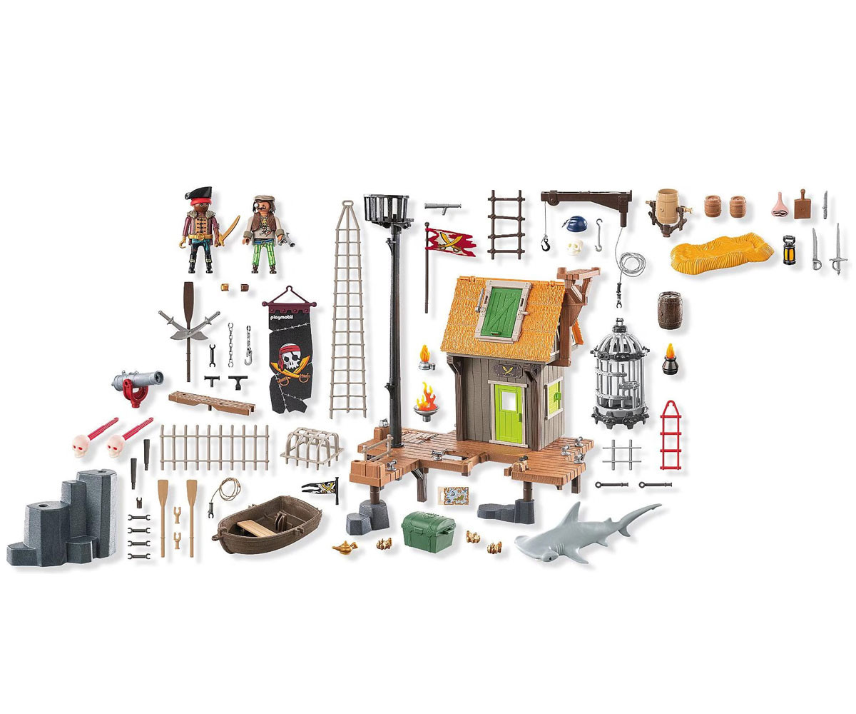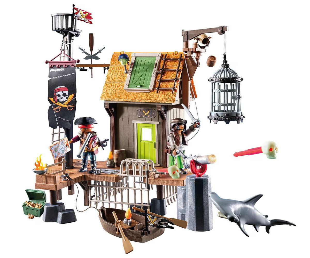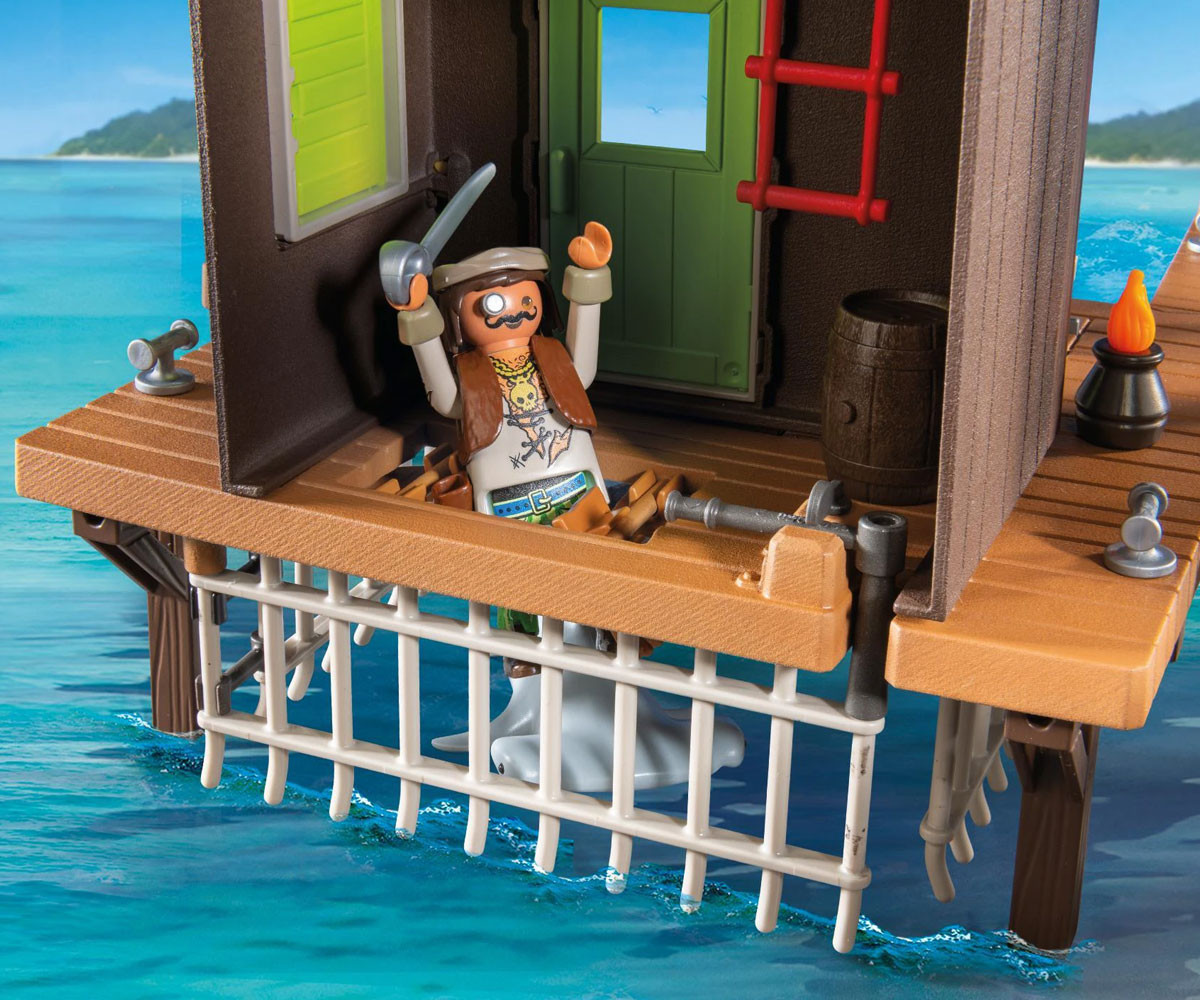 Голямото пиратско пристанище PLAYMOBIL не служи само като пристан за пиратски кораби, но и като страховит затвор! В голямата клетка под наблюдателната къщичка, могат да бъдат затворени опасни акули или пирати! Сигнал за тревога? Смъртоносното оръдие и голямата въртяща се бъчва, от която могат да бъдат хвърляни по-малки бъчви към нападателите, защитават пристанището от нашественици. Приключението те очаква в пиратското пристанище PLAYMOBIL! С пропадащи кейове, светещи в тъмното снаряди с черепи и скрито съкровище под наблюдателната платформа, това пристанище е пълно с изненади за врагвете. Хвани съперници или морски чудовища в огромната клетка и отблъсни нападателите с въртящия се кран и капаните. Плаващата лодка и яростната акула добавят допълнително напрежение към твоите пиратски истории. Този комплект PLAYMOBIL е изпълнен с дръзки функции и сложни детайли и преобразува всяка детска стая в приключение в открито море, идеален за млади пирати!
