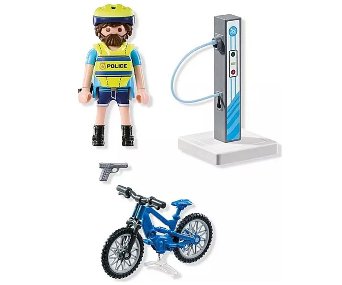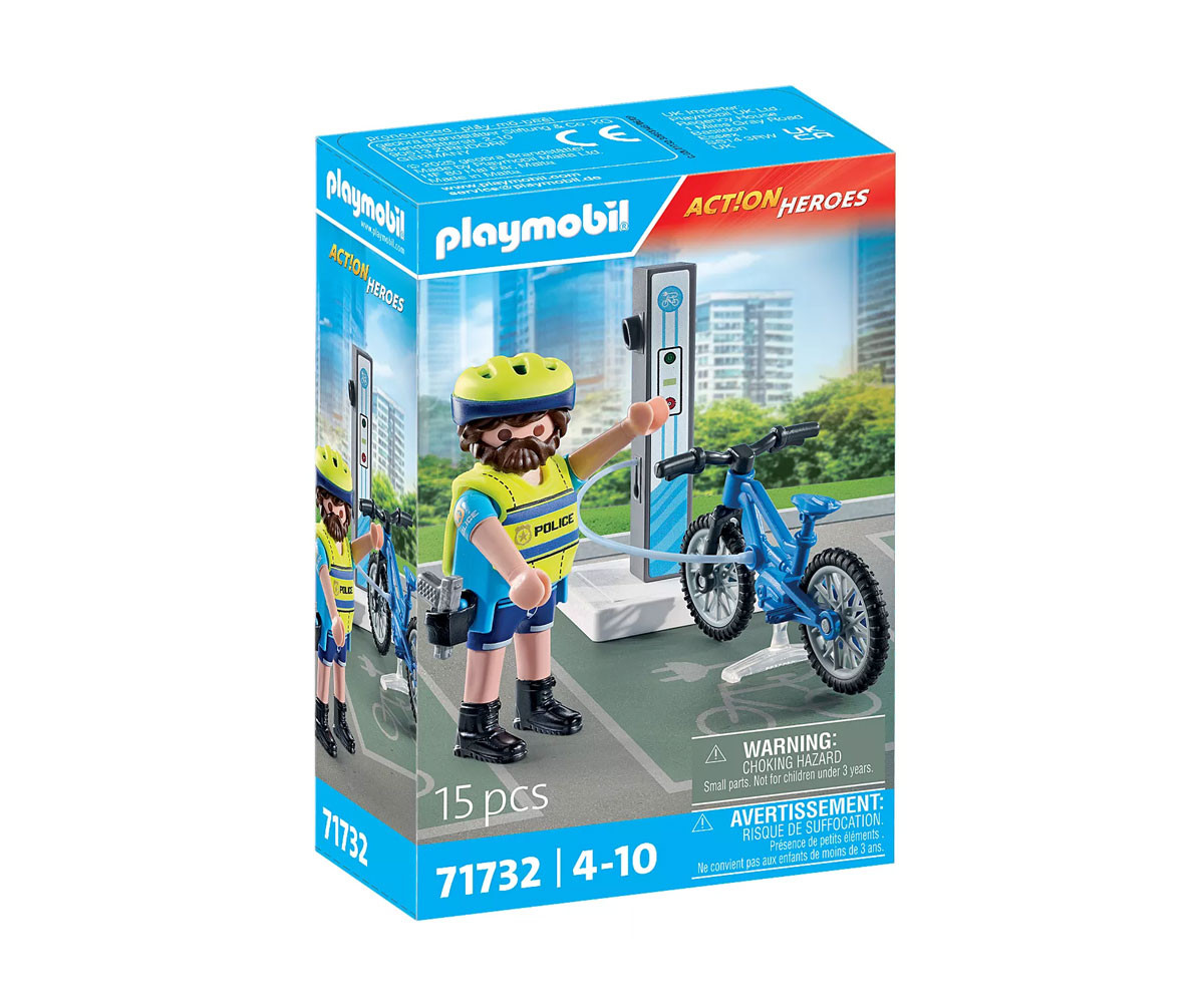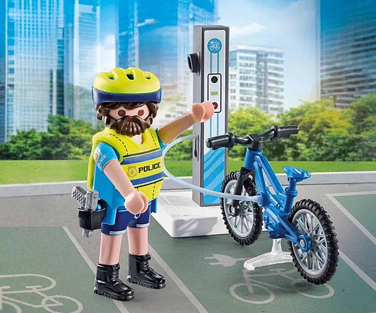 В градската джунгла най-бързият начин за този полицай да стигне до мястото на инцидента е с неговия електрически велосипед. За да може да го прави надеждно, батерията на велосипеда трябва редовно да се зарежда на зарядната станция. Качи се на велопатрула и се впусни в градски приключения с PLAYMOBILl! Оборудван с модерен електрически велосипед и реалистична зарядна станция, този комплект е перфектен за динамични градски приключения. Свалящите се полицейска каска и кобурът добавят допълнителни детайли, докато стойката на велосипеда гарантира, че той е винаги готов за следващата мисия. Независимо дали патрулирате по улиците или бързо пътувате към мястото на престъплението, агентът остава видим в ярко оцветената си жилетка. Този PLAYMOBIL комплект съчетава вълнение и реализъм, осигурявайки безкрайни истории за героичната полицейска работа в динамичния град.