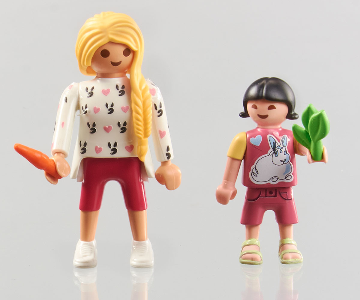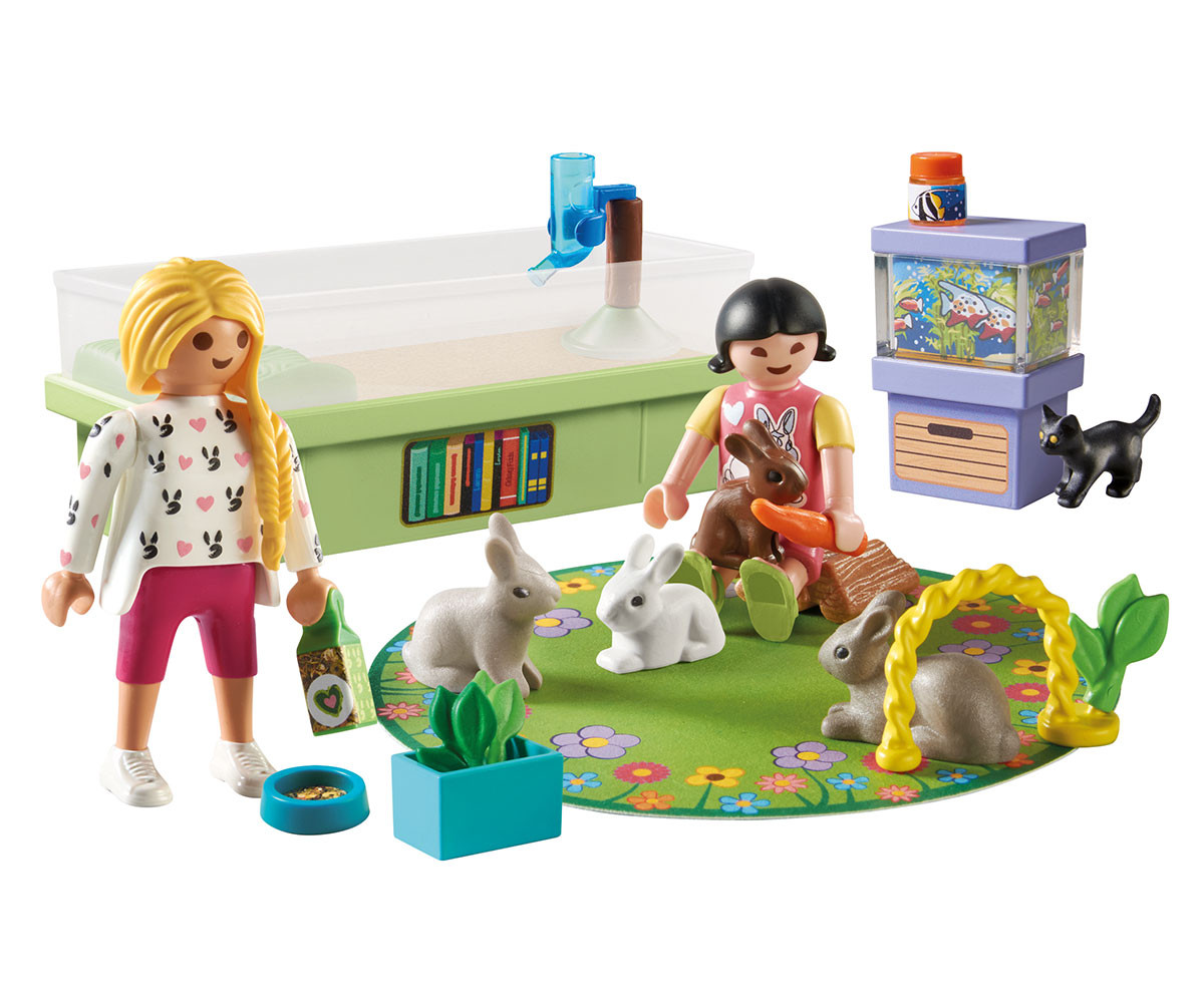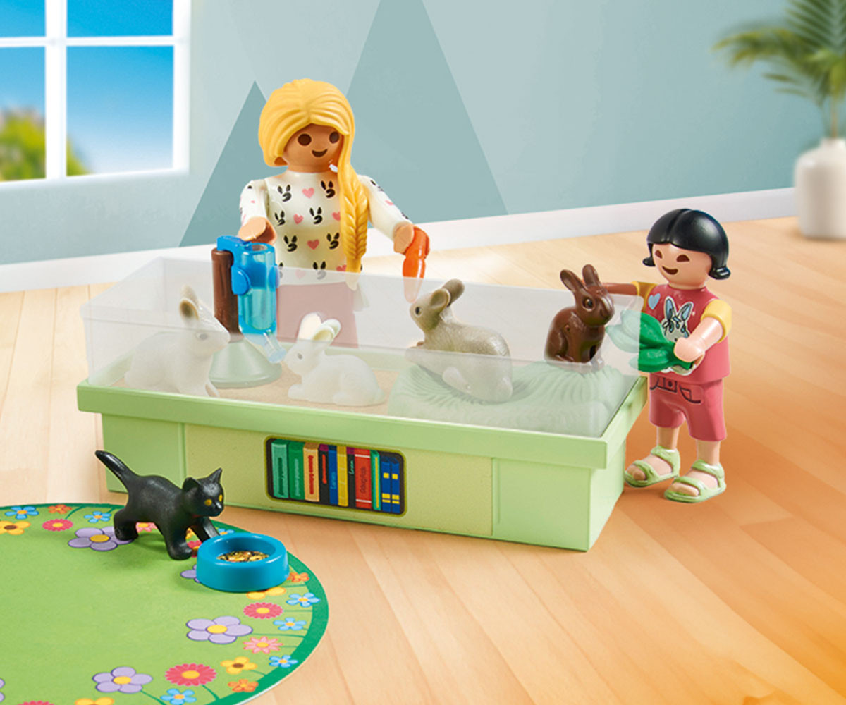 Днес семейство зайчета изследват градината. Те имат достатъчно храна и вода в своето уютно заграждение. Зайчетата се чувстват като у дома си и със съседите си – игривото котенце и пъстрите рибки в аквариума. Комплектът PLAYMOBIL Семейство зайчета предлага всичко необходимо за вълнуваща игра! Техният уютен дом осигурява достатъчно място, храна и вода. Те скачат през арки, гризат моркови и си почиват до своите приятели – малко котенце и цветни рибки в аквариум. Този комплект PLAYMOBIL съдържа всичко, от което децата се нуждаят за въображаема игра – от чувалче с храна до постелка за игра – създавайки безкрайни възможности за забавление и приключения.