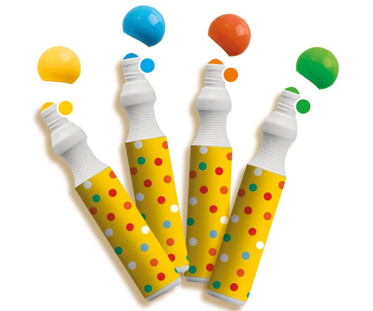 Открий XXL маркери за точки – 4 цвята, създадени специално за малки ръчички! Тези XL маркери са лесни за хващане и измиват се лесно, което ги прави идеални за първи творчески опити. Комплектът включва жълт, оранжев, син и зелен маркер – перфектни за създаване на забавно изкуство с точки.