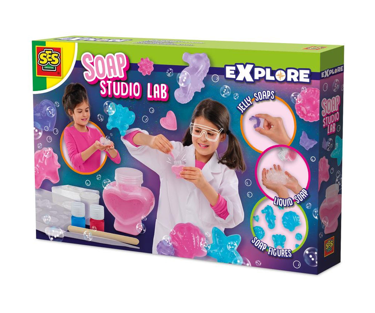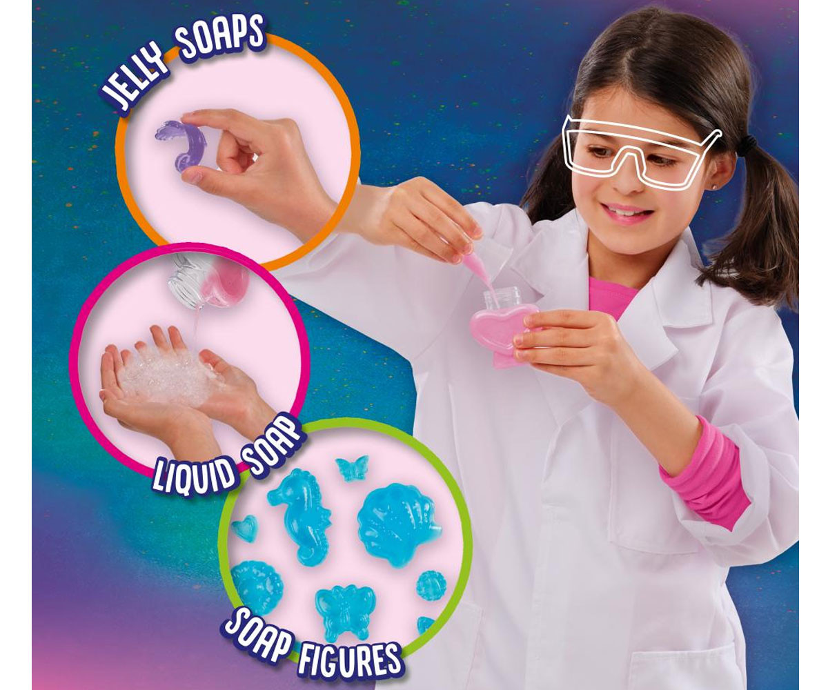 Създайте свои собствени сапуни! Потопете се в света на науката и експериментите с Лаборатория за сапуни! С този страхотен комплект можете да създадете три вида - – гел, твърд и течен - само с една основна съставка. А най-хубавото? Можете да съхранявате своите творения в сладка бутилка с форма на сърце с капачка. Перфектното занимание за всички, които обичат да експериментират и да създават свои козметични продукти!
