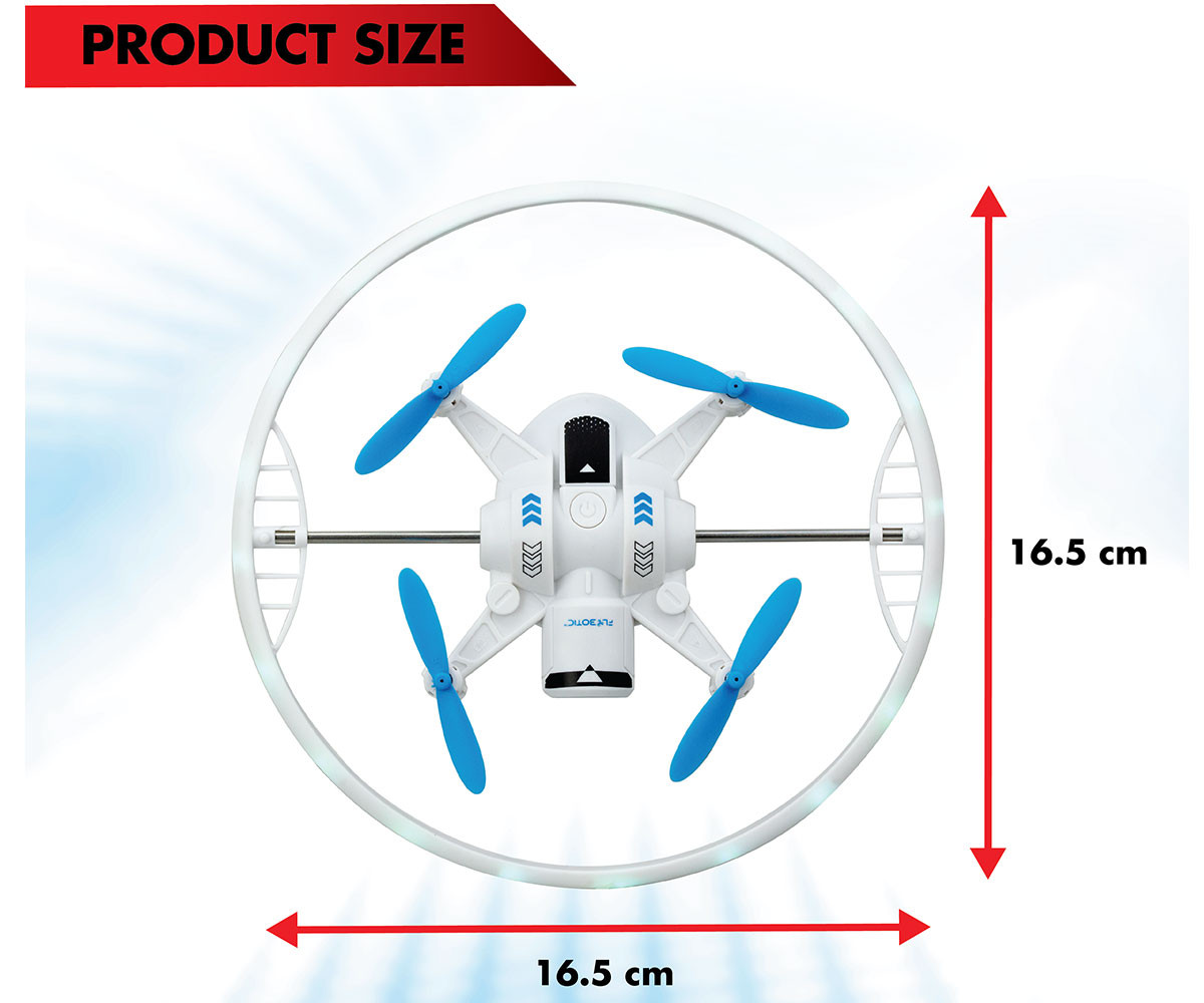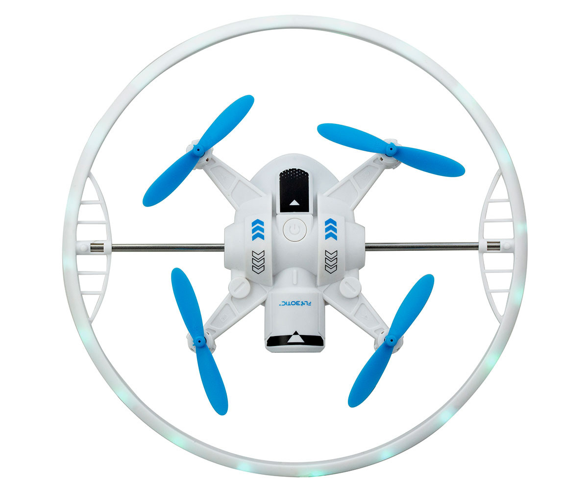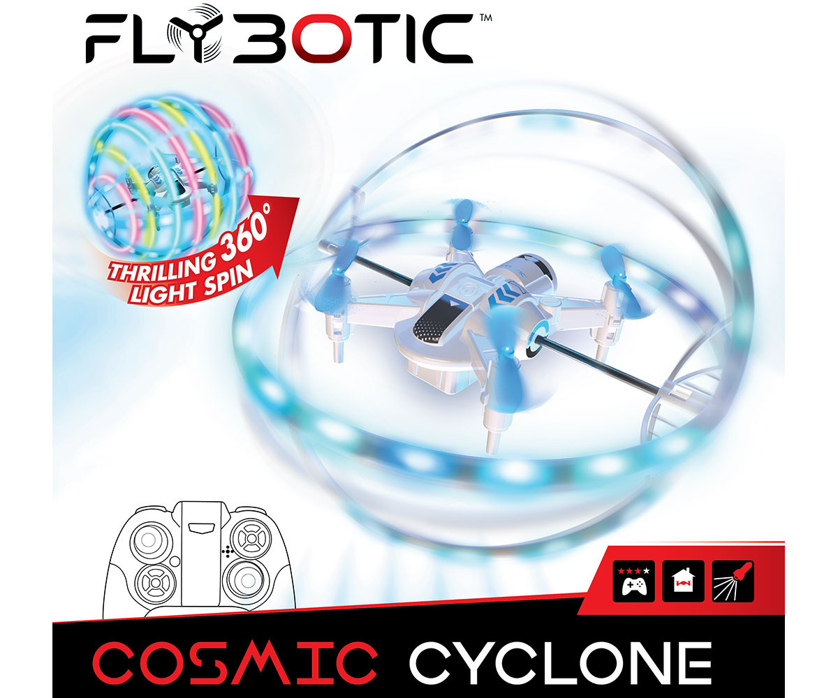 Flybotic Cosmic Cyclone – Детски дрон с LED светлини и въртяща се светлинна рамка. Flybotic Cosmic Cyclone е много повече от обикновен детски дрон – това е вълнуваща летяща светлинна сфера, която ще впечатли всички със своето движение и светлинни ефекти! С въртящ се LED пръстен и автоматична функция за задържане във въздуха, този дрон предлага невероятно зрелище и лесно управление. Когато дронът излети, той се превръща в завладяваща светеща топка с 7 различни LED светлинни модела в ярки цветове. Въртящата се LED рамка може да се върти непрекъснато или да бъде фиксирана под определен ъгъл – за впечатляващо светлинно шоу!