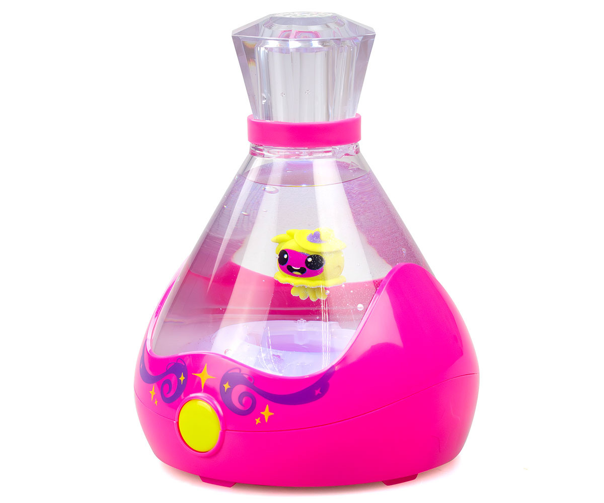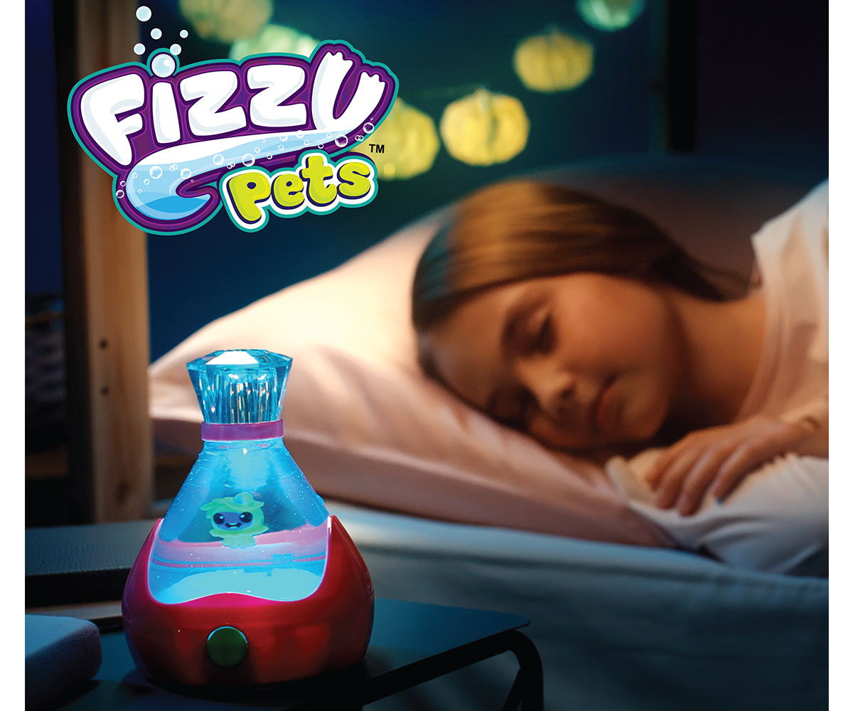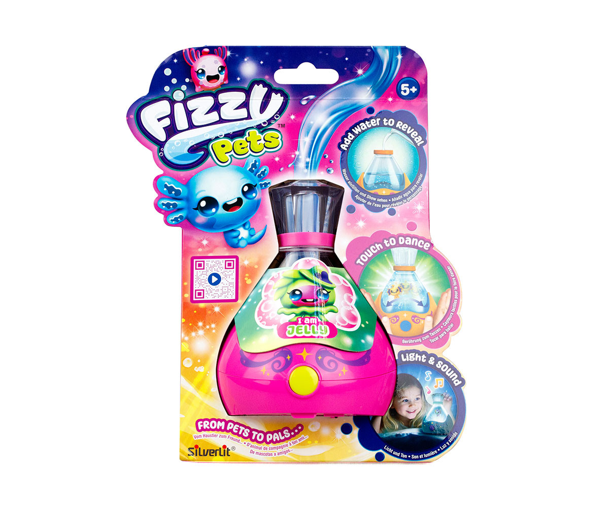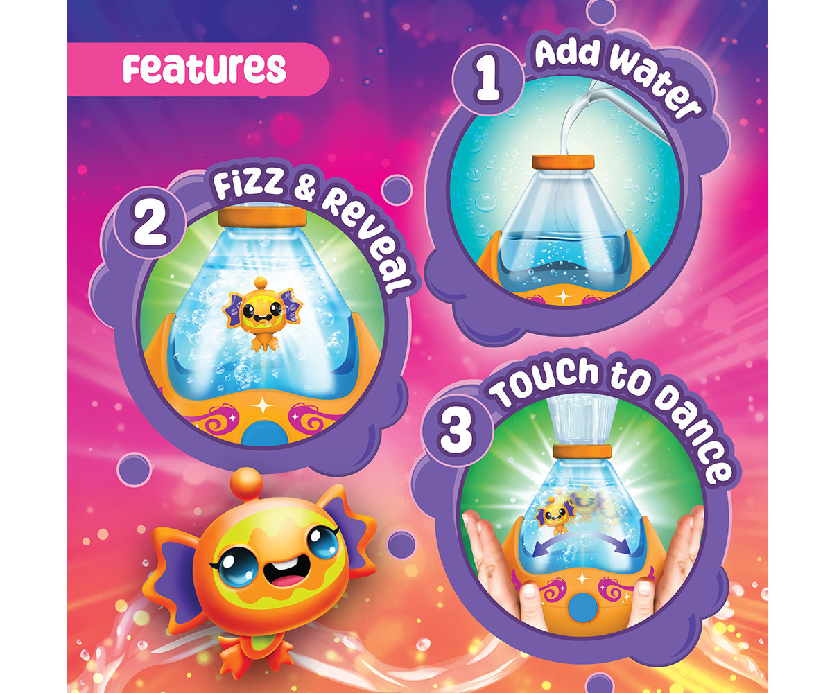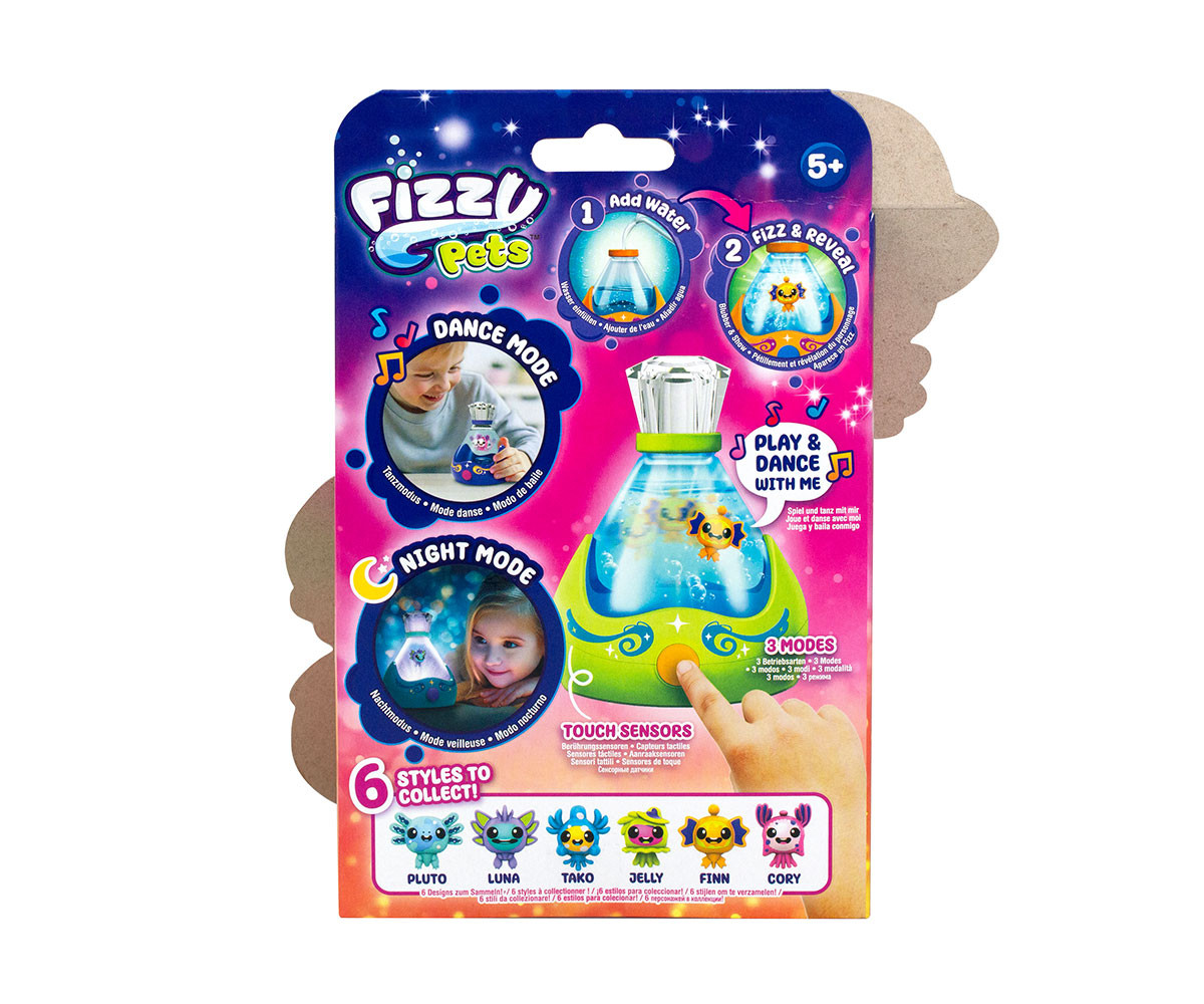 FIZZY PETS е мистериозен приятел, който се крие в омагьосана бутилка! Просто добави вода и гледай как FIZZY PET изскача с ефектно „шумолене“ и мехурчета! Играй със своя нов приятел, като докосваш лявата или дясната страна на бутилката – и наблюдавай как FIZZY PET магически плува със светлинни и звукови ефекти. Натисни бутона, за да влезеш в танцов режим, при който твоето FIZZY PET ще танцува весело на до 5 различни песни. Задръж бутона по-дълго, за да активираш нощен режим – тогава FIZZY PET ще плува бавно с още 5 различни приспивни мелодии, докато те придружава в съня. Успокояващите и сияйни нощни светлини го правят чудесна украса за детската стая. Можеш редовно да сменяш водата в бутилката, за да поддържаш FIZZY PET чисто и спретнато. Налични са 6 различни цвята бутилки и герои за избор. Препоръчителна възраст: 5+ години.