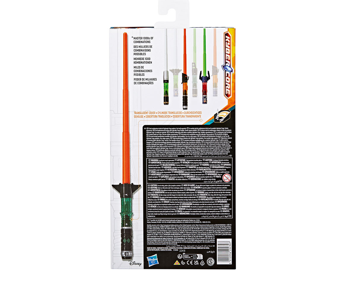 Деца на възраст 4 и повече години могат да си представят свои собствени ролеви дуели със светлинните мечове на Междузвездни войни. Светлинен меч с възможност за персонализиране се отличава с вдъхновен от героите дизайн и разтегателно острие, което се отваря и се свива. Използвайте включеното острие, капачка, капак и сърцевина, за да създадете светлинен меч и си представете как овладявате Силата. И с части, които са съвместими в цялата линия Star Wars Lightsaber Forge, децата могат да смесват и съпоставят, за да създават, персонализират и овладяват 1000 комбинации! (Общите комбинации включват всички продукти на Lightsaber Forge. Допълнителни продукти на Lightsaber Forge, всеки се продава отделно. В зависимост от наличността).