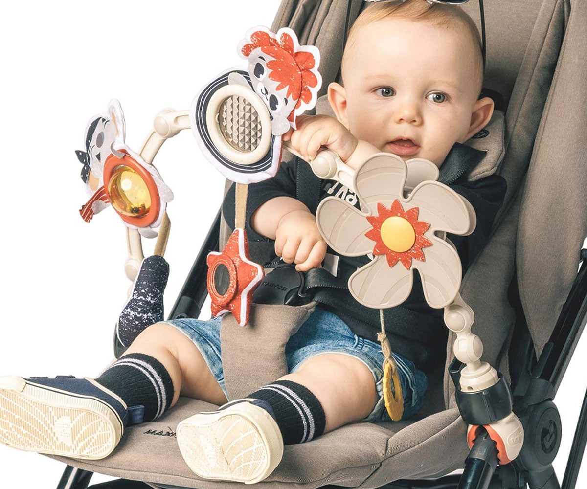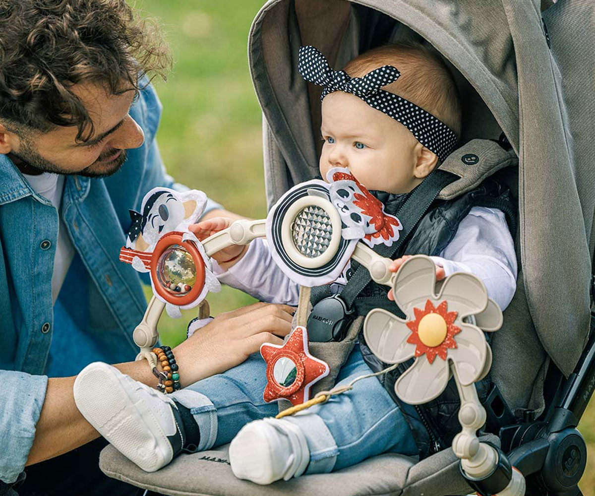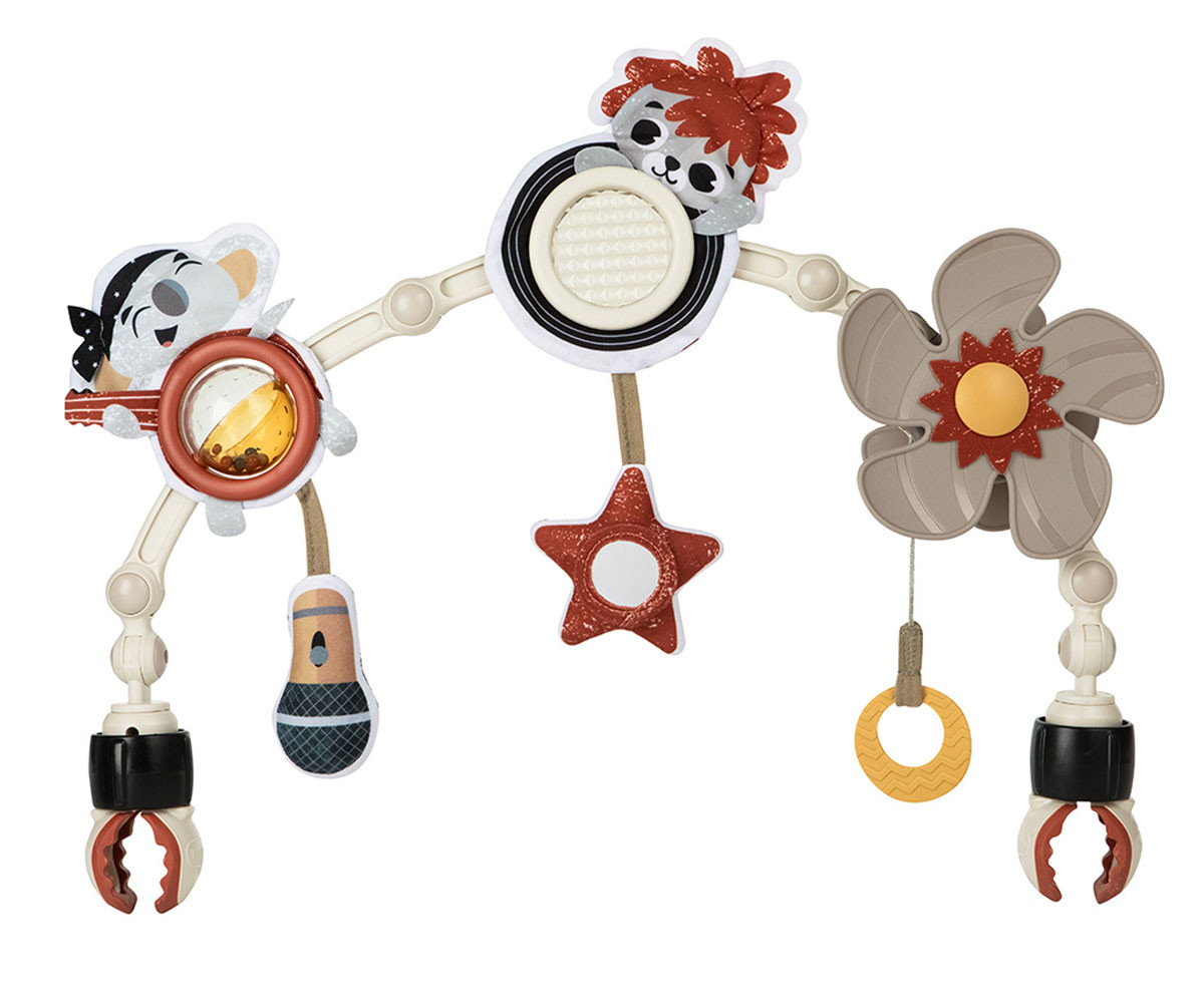 Арка с тематични рокендрол играчки, която се монтира лесно с универсални щипки и забавлява бебето по време на разходка. Част от колекцията Tiny Rockers, вдъхновена от духа на Rock’n’Roll културата. Играчката предлага визуална, звукова и тактилна стимулация, като подпомага развитието на фината моторика, когнитивните умения и въображението. Подходяща за количка със седалка или кош за новородено.