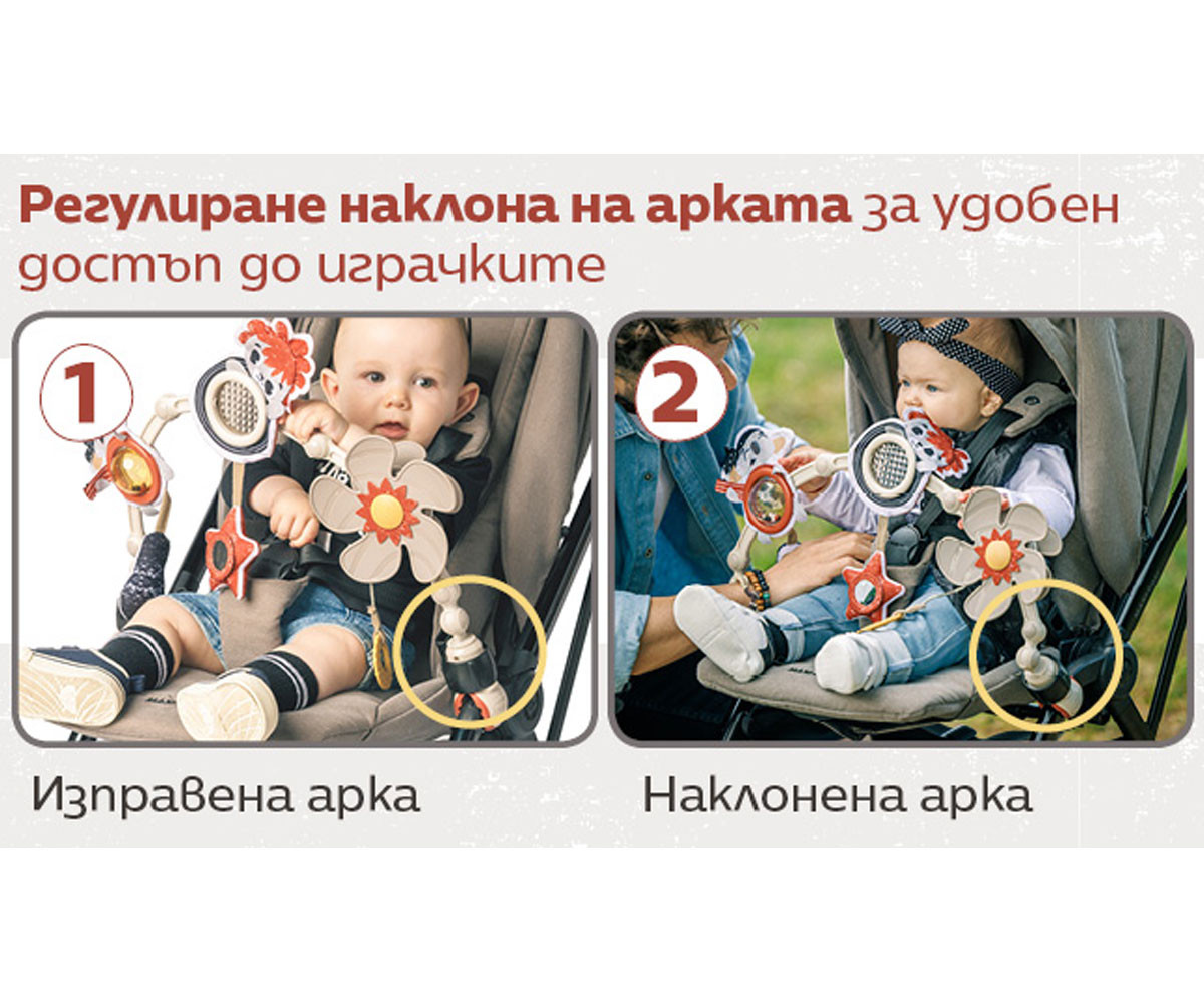 - 0-2 месеца - Зрителна стимулация. Поставете арката на подходящо разстояние, за да стимулирате фокусирането и проследяването с поглед;