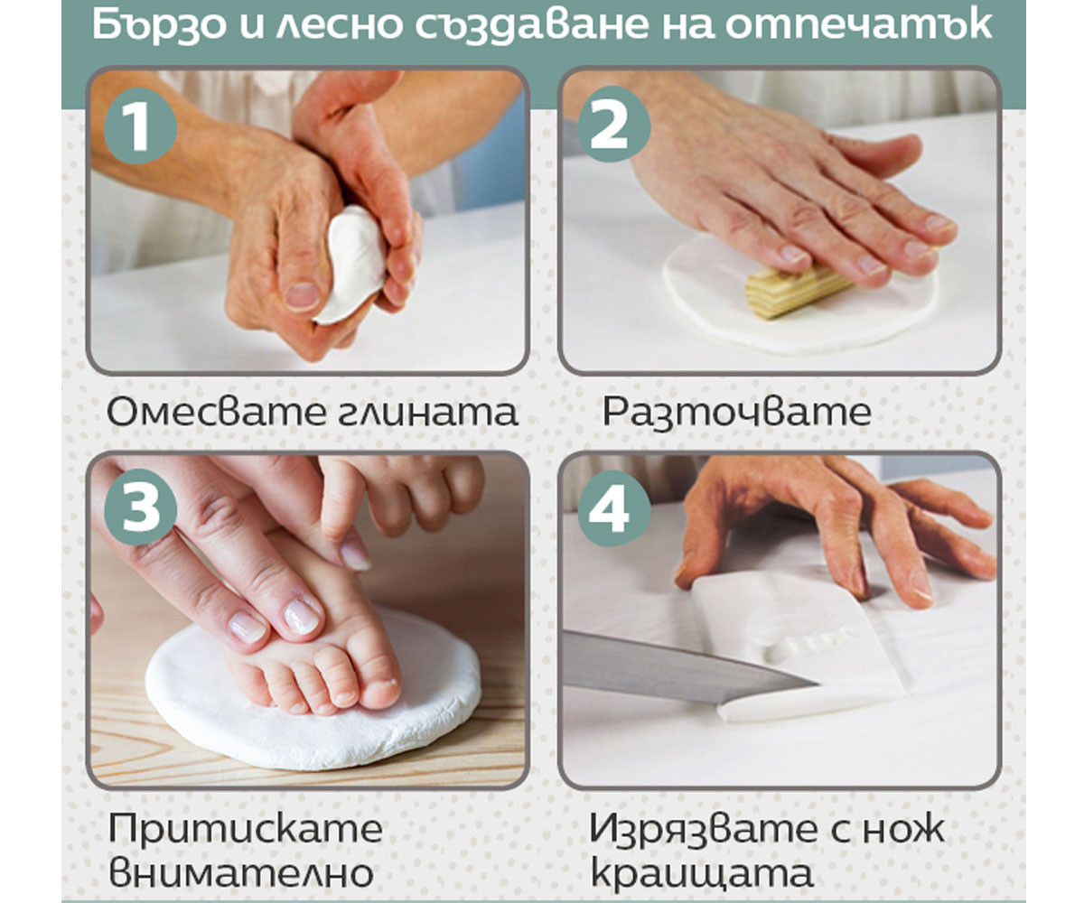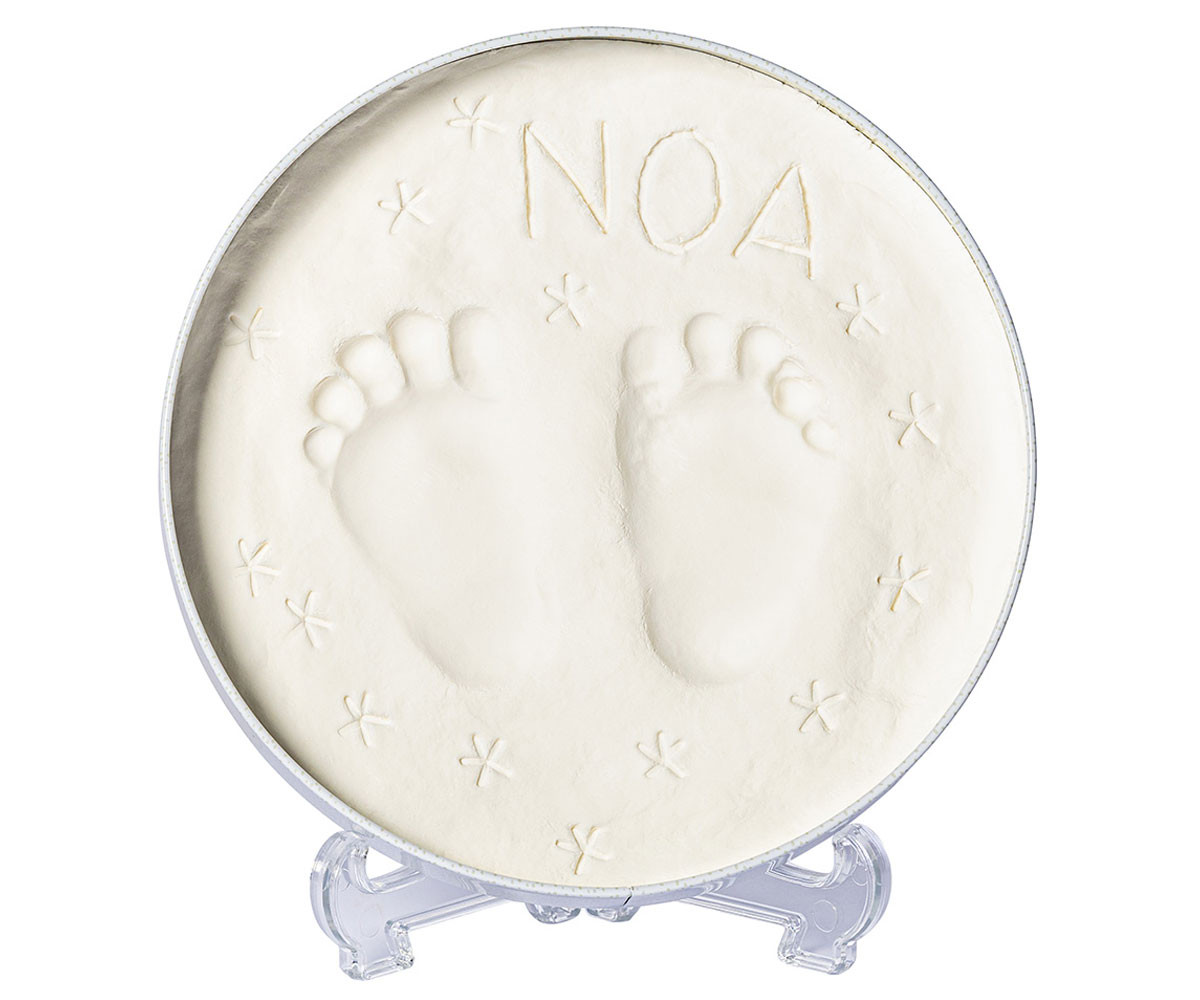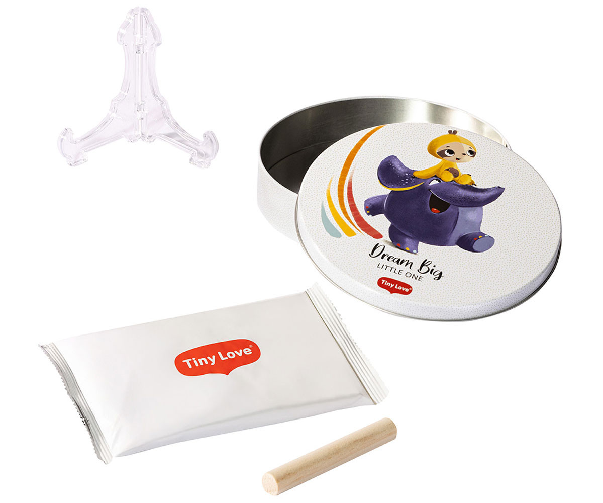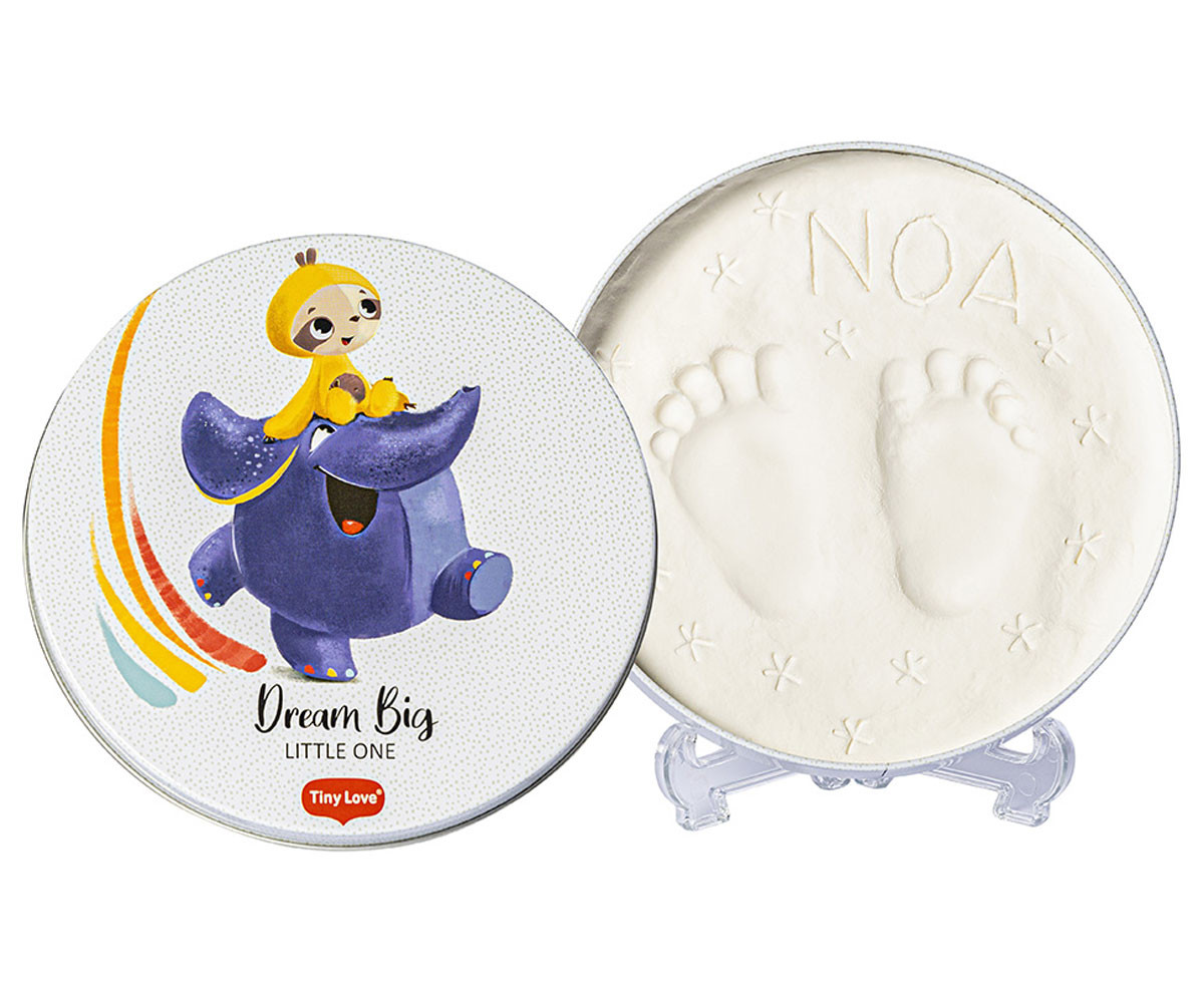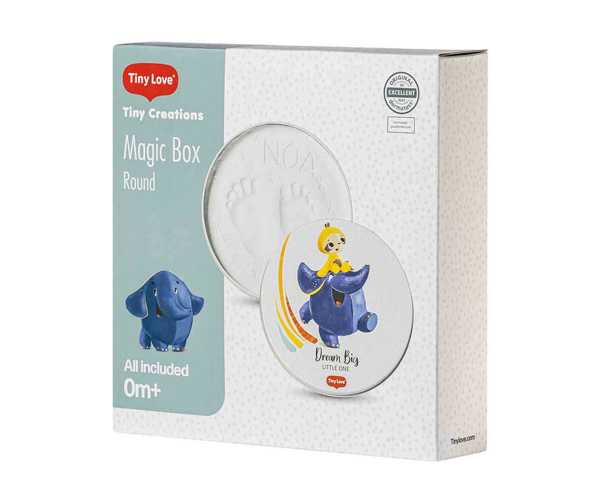 Кръглата декоративна кутия за отпечатък Tiny Love Magic Box Dream Big от серията Tiny Creations е великолепен подарък и уникален спомен за цялото семейство. Тя предлага оригинален начин да запазите отпечатък от мъничките ръчички или крачета на бебето – лесно, бързо и без да нацапате наоколо. Стилният сувенир може да се изложи във витрина или на рафт с включената в комплекта дискретна и елегантна поставка, която допринася за уютна атмосфера у дома.
