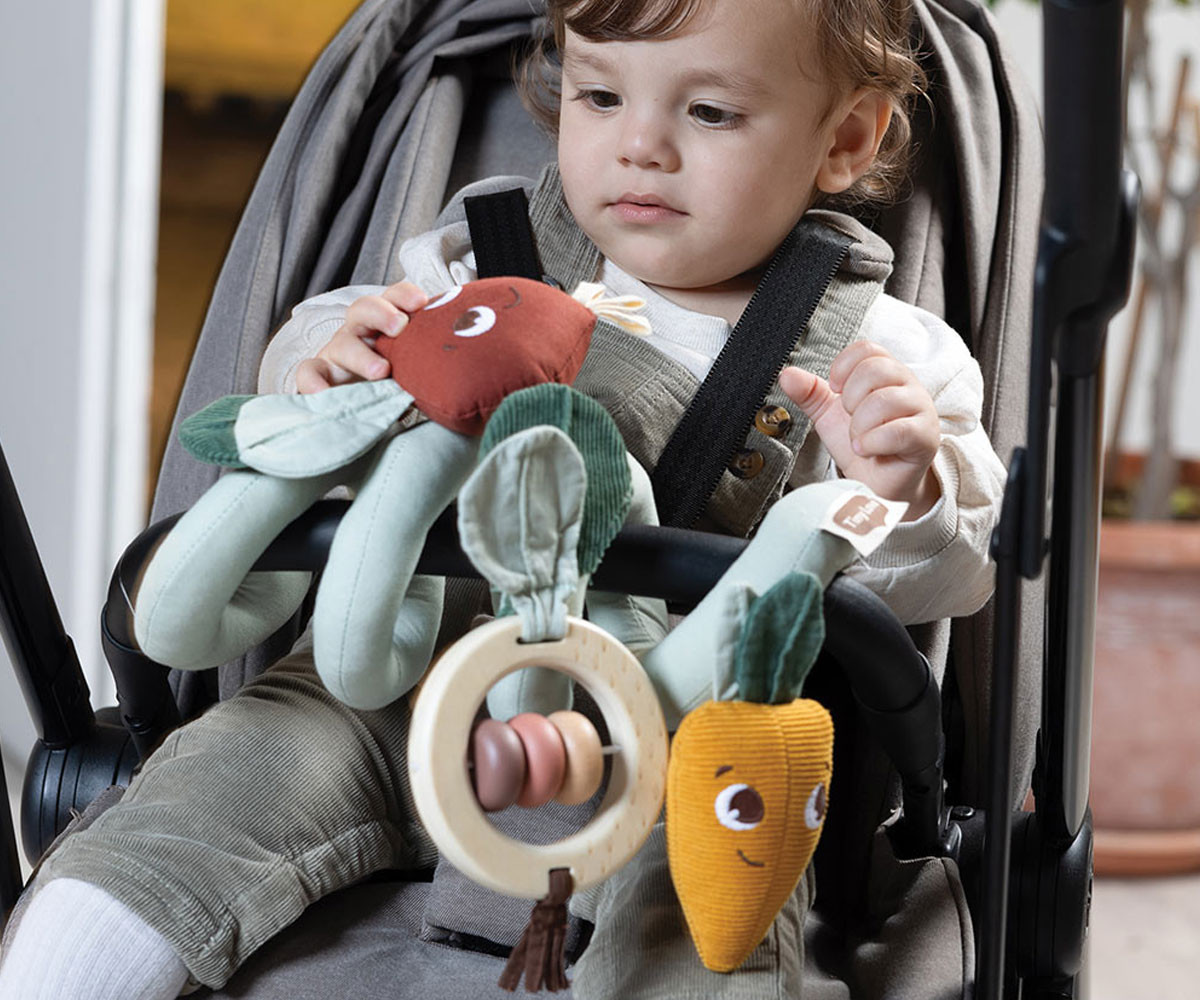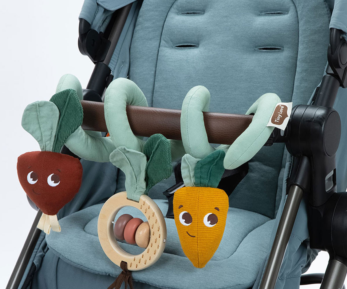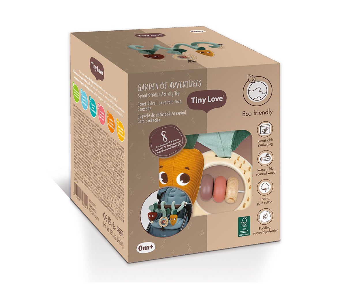 Меката играчка-спирала за количка Tiny Love от Еко колекцията Garden of Adventures е създадена, за да забавлява и стимулира развитието на сетивата на новороденото бебе. Нежната памучна спирала с очарователни герои и разнообразни текстури подпомага развитието на зрението, слуха и двигателната координация, независимо дали сте у дома или на разходка.