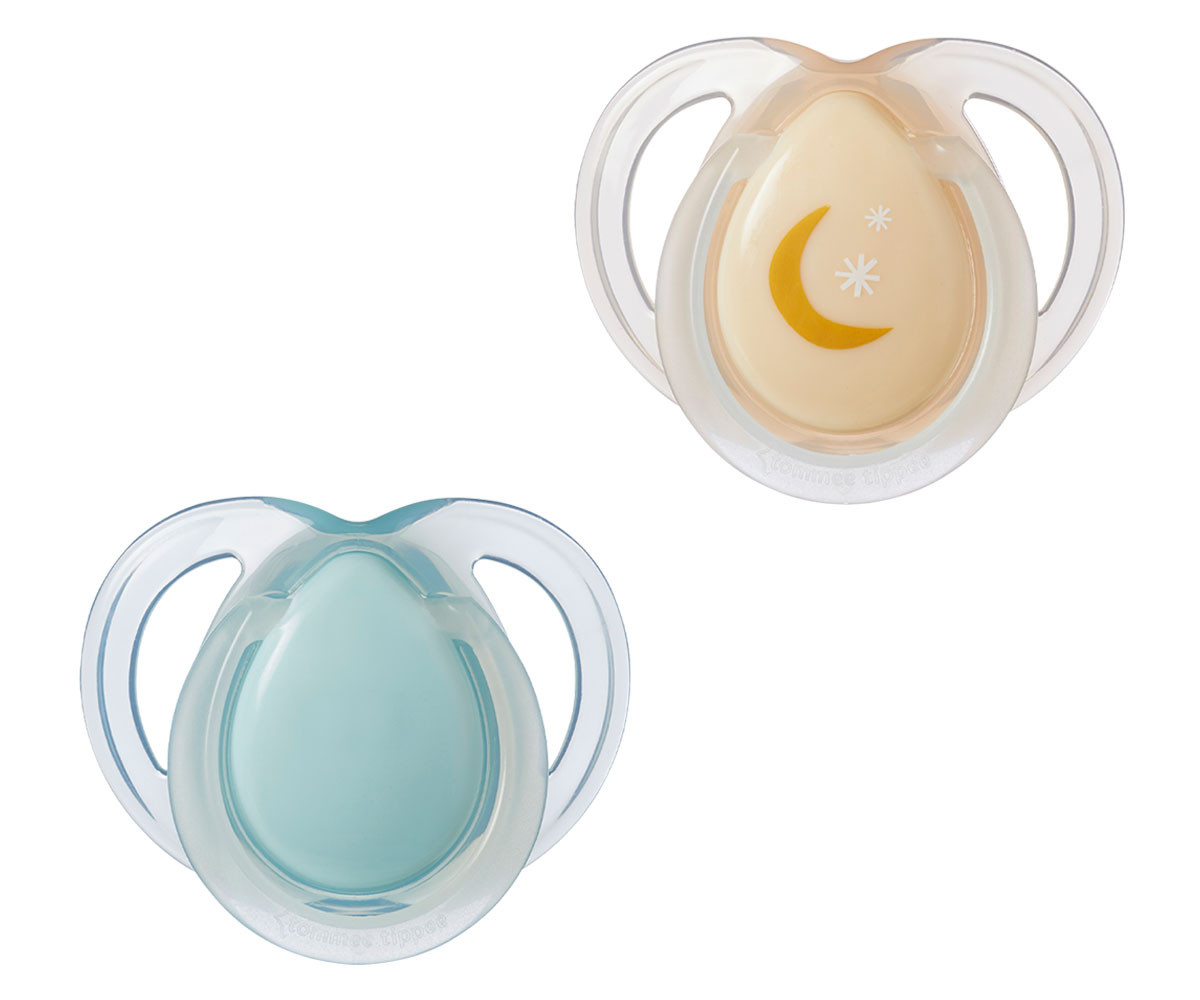 - 2 броя ортодонтични залъгалки Tommee Tippee Night Time (0-6м);